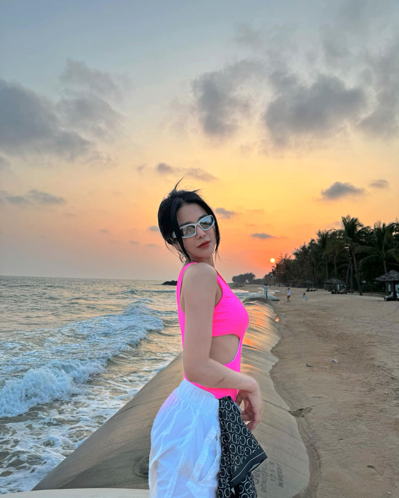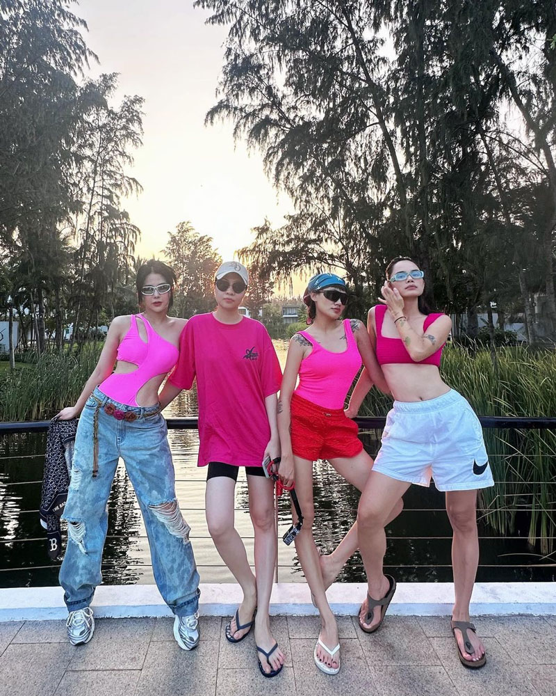 Diệp Lâm Anh vừa có chuyến nghỉ dưỡng Vũng Tàu cùng hội bạn thân 14 năm. Theo dresscode màu hồng neon của hội chị em, Diệp Lâm Anh mặc áo tắm cut-out phối cùng quần jeans rách để chụp hình.