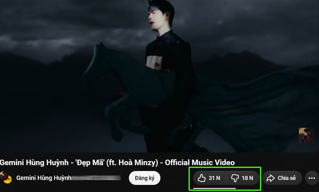 Tính đến sáng 31/3, tỷ lệ dislike của MV "Đẹp mã" chiếm hơn một nửa so với like trên kênh YouTube của Hùng Huỳnh (tham khảo số liệu từ tiện ích mở rộng do YouTube đã ẩn số dislike).