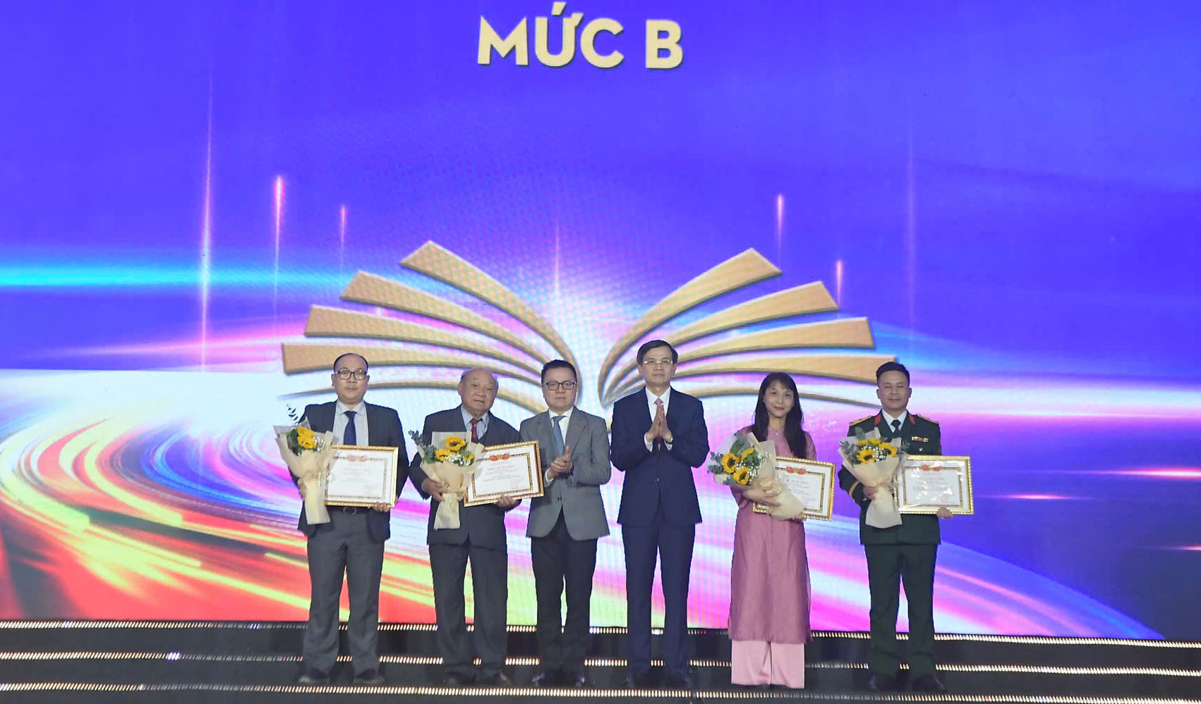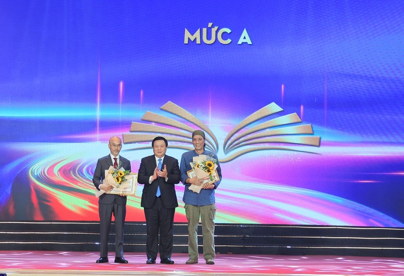 PGS.TS Đoàn Minh Huấn - Phó Giám đốc Học viện Chính trị Quốc gia Hồ Chí Minh và nhà báo Lê Quốc Minh - Tổng biên tập Báo Nhân dân, Chủ tịch Hội Nhà báo Việt Nam trao tặng thưởng cho các tác giả có tác phẩm được tặng thưởng mức B.
