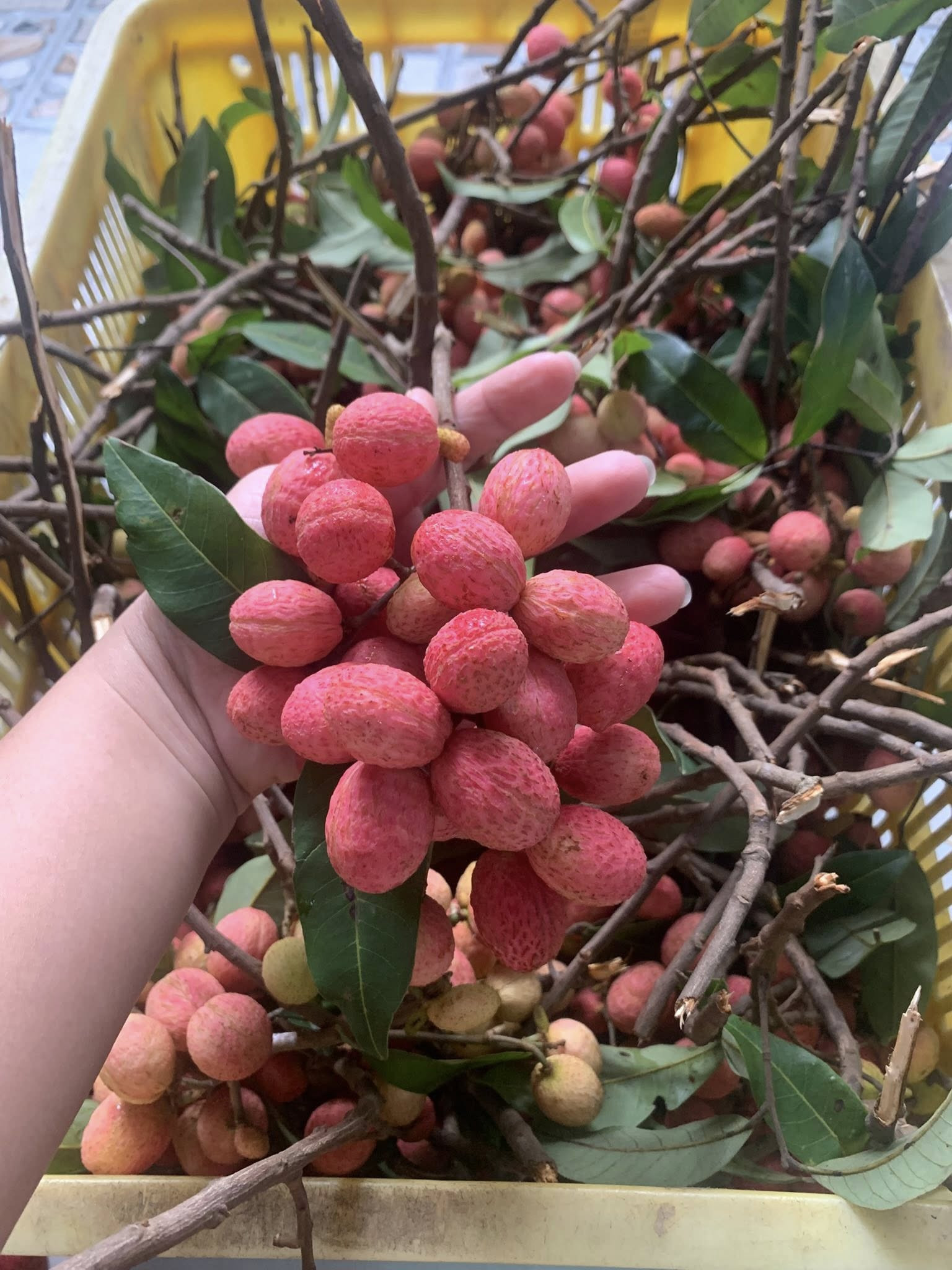 Trái của loại cây này trông giống quả vải ở miền Bắc nhưng kích thước nhỏ bằng 1/3, vỏ mỏng, màu đỏ sậm hoặc trắng ngả hồng, tùy cây.
