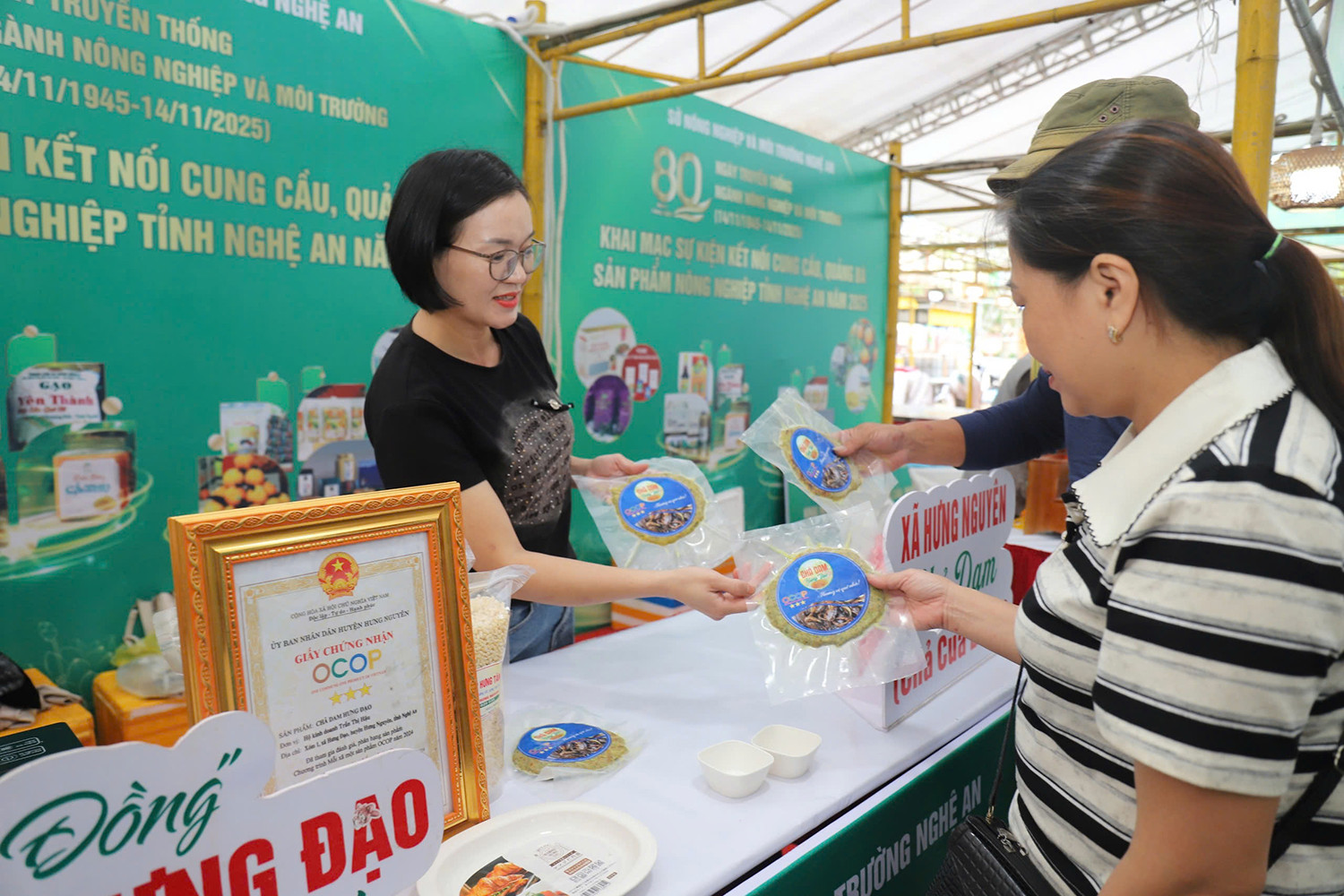 Chị Hậu giới thiệu món chả cua đồng đến thực khách tại hội chợ kết nối sản phẩm nông nghiệp diễn ra vào cuối năm 2025 tại Nghệ An. Ảnh: Đ.H