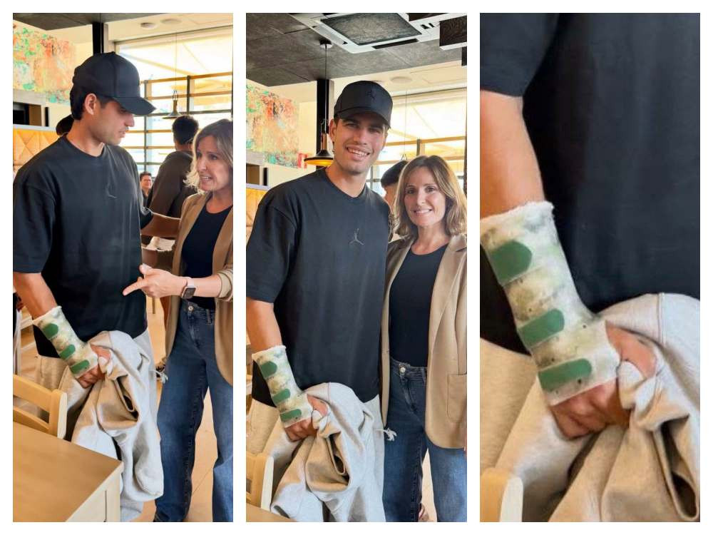 Hình ảnh mới đây của Alcaraz với cổ tay bó nẹp - Ảnh: Jose Moron