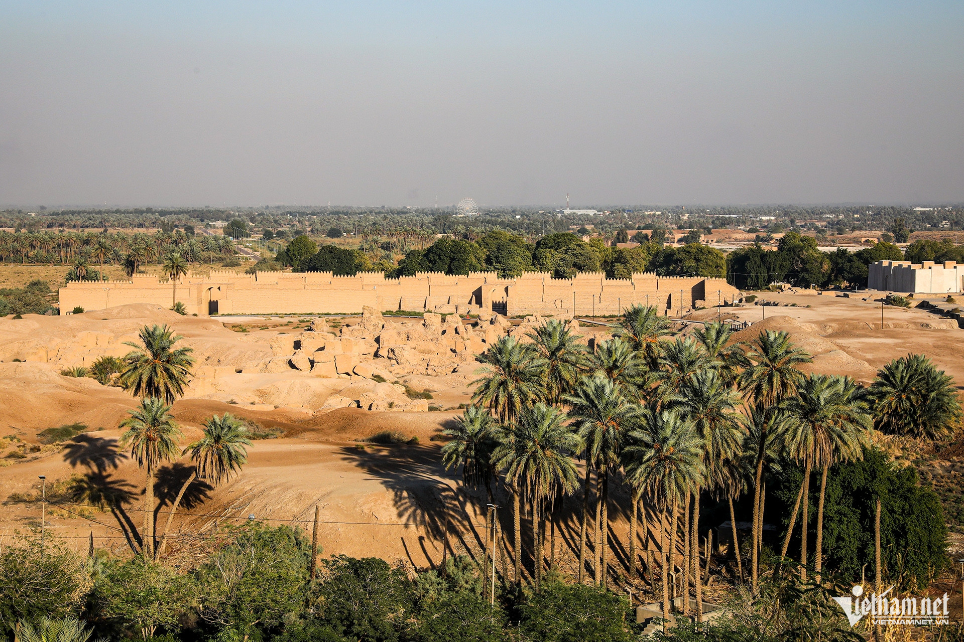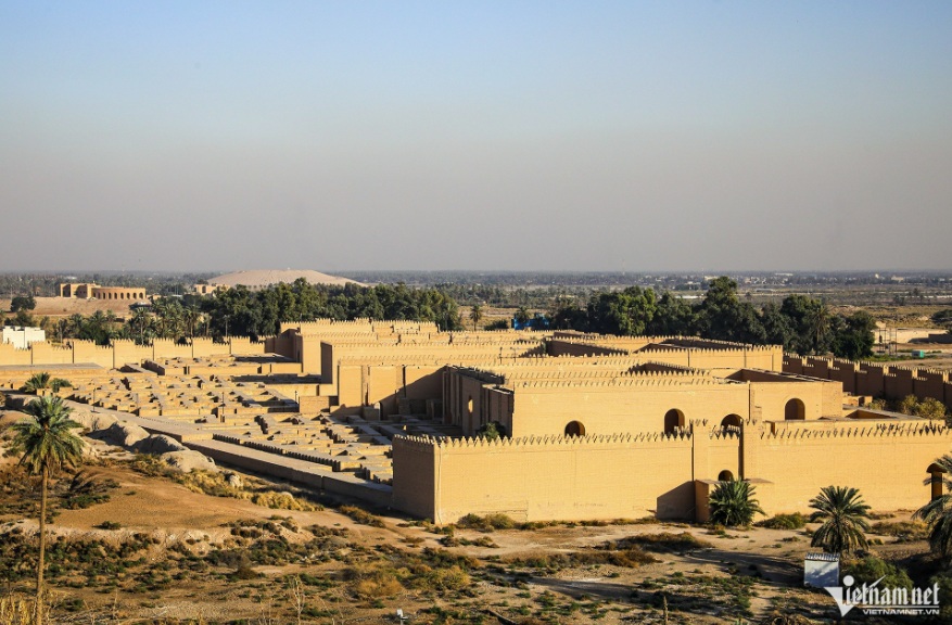 Trong ảnh là dinh thự cố Tổng thống Saddam Hussein, được xây dựng gần các tàn tích lịch sử, mô phỏng theo vua Nebuchadnezzar II. Nơi đây từng gây nhiều tranh cãi về việc bảo tồn di sản. Để có được công trình này, ông Hussein đã cho giải phóng mặt bằng một làng bên cạnh, đắp đất thành một quả đồi với mục đích mỗi sáng thức dậy có thể ngắm nhìn toàn cảnh thành phố Babylon cổ xưa.