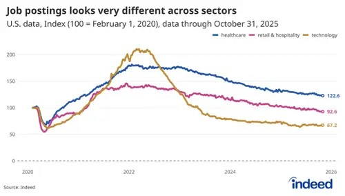 Biểu đồ của Indeed cho thấy số bài đăng tuyển dụng công nghệ tại Mỹ giảm mạnh từ đỉnh năm 2022. Ảnh: Indeed
