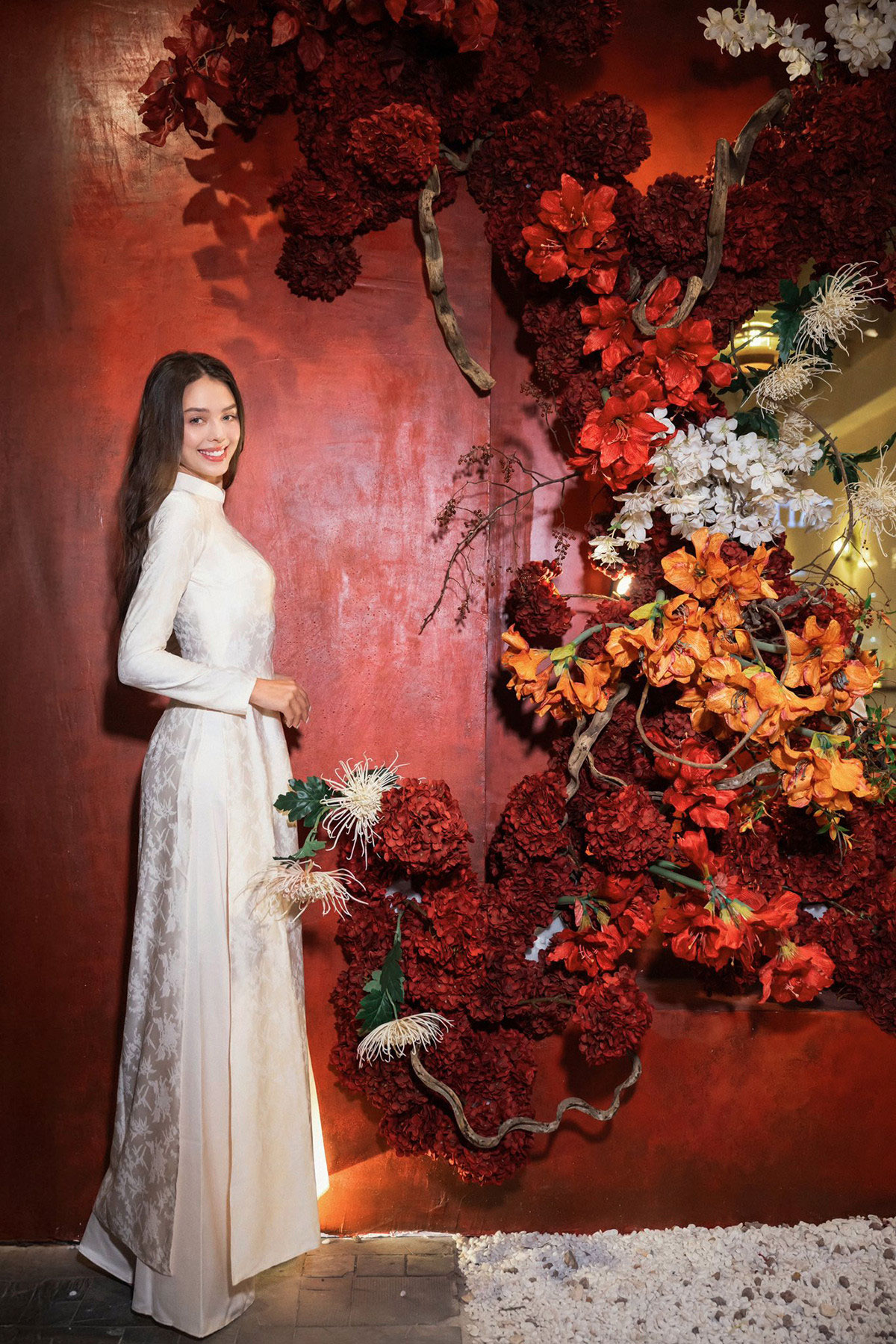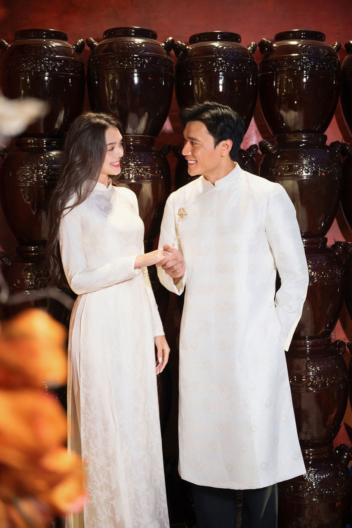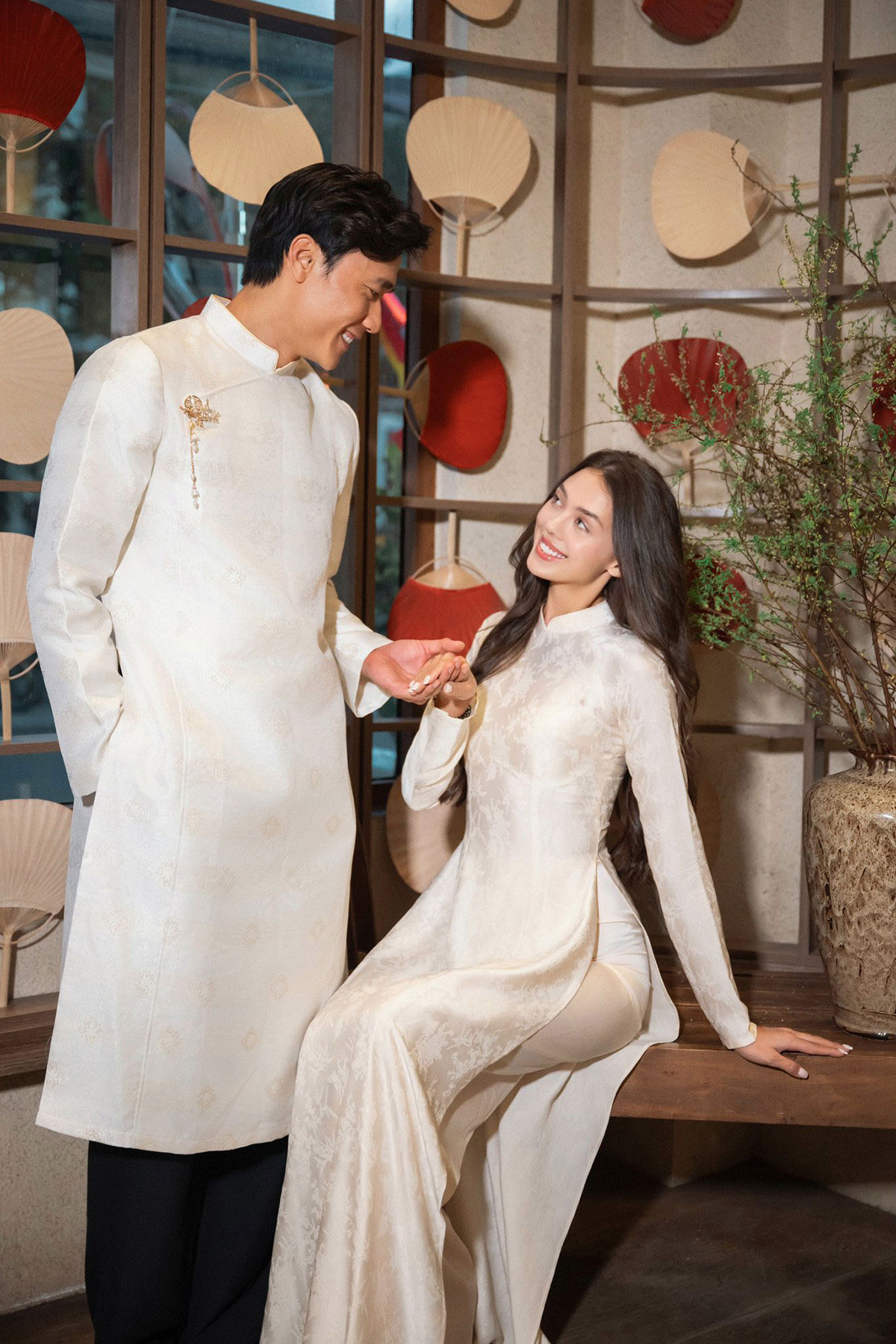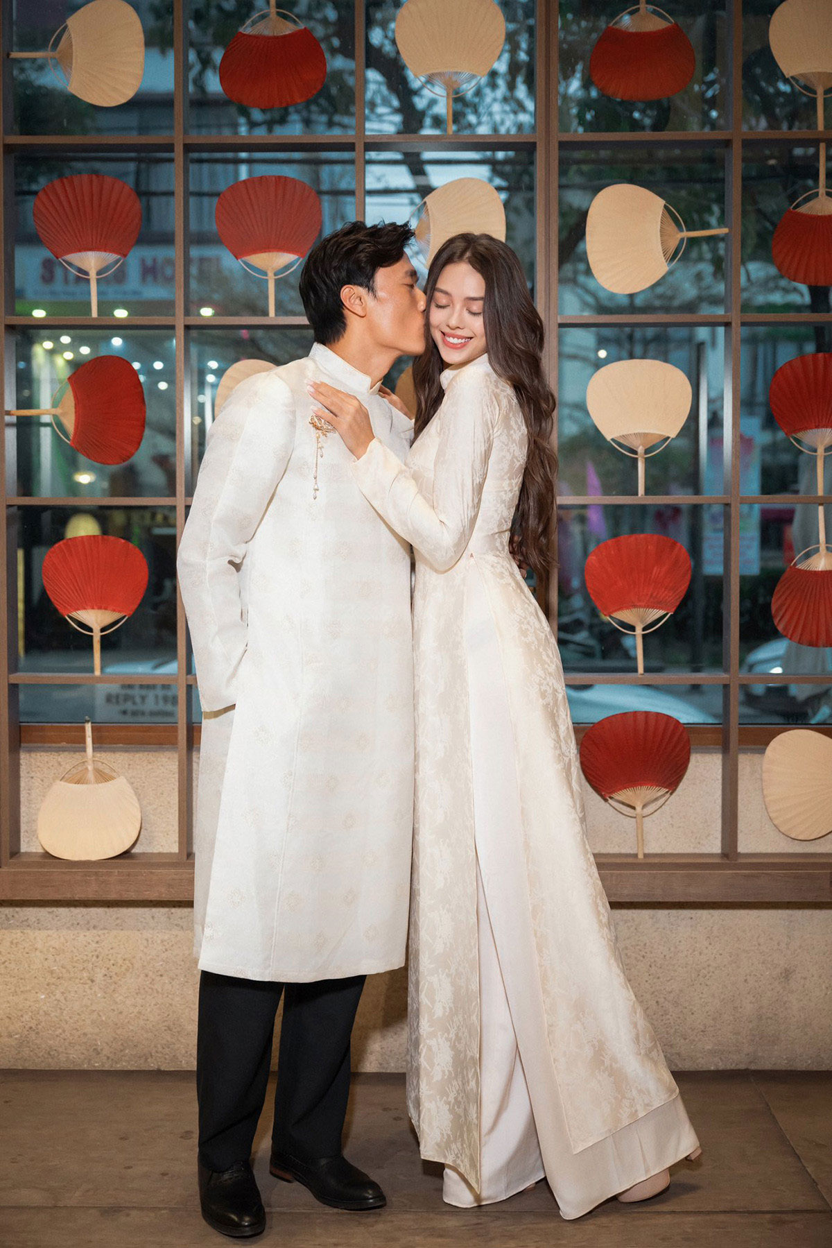 Cô nàng mặc áo dài rất đẹp, tạo dáng bên cựu thủ thành U23 Việt Nam.