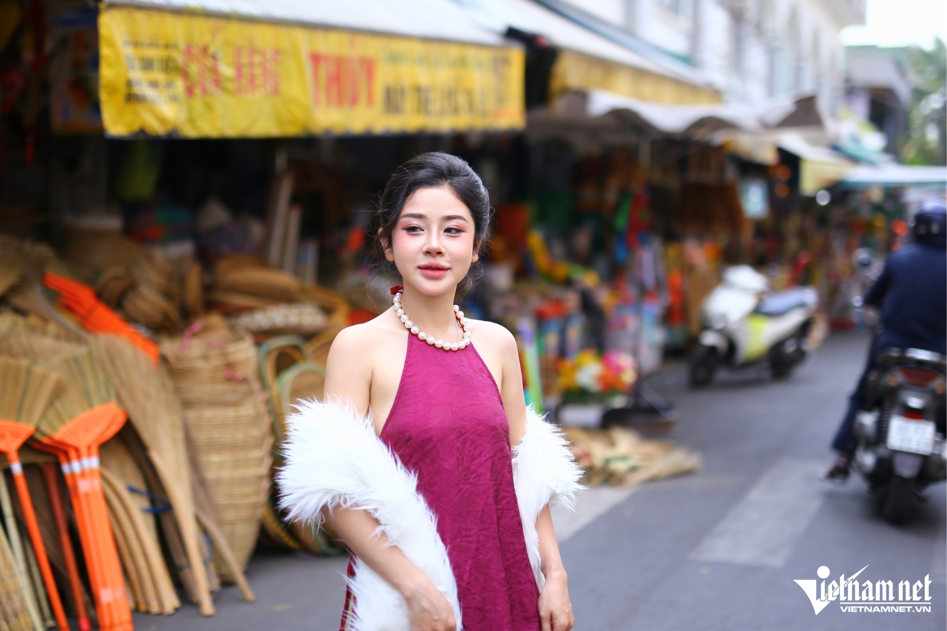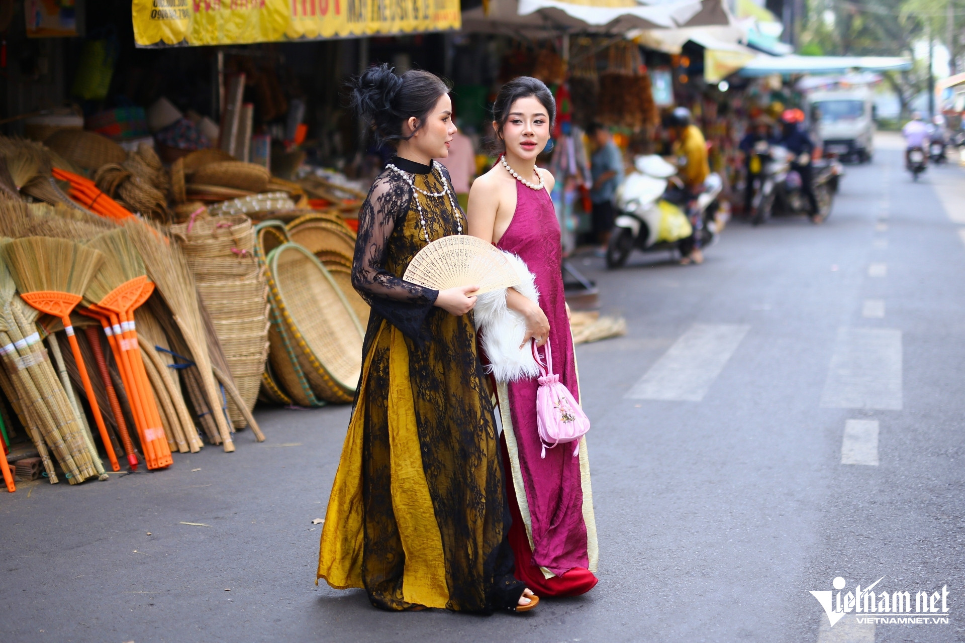 Từ sáng sớm, từng nhóm bạn trẻ đã có mặt, xúng xính trong tà áo dài truyền thống hoặc cách tân, tay cầm giỏ mây, hoa tươi, hòa mình vào dòng người mua bán rộn ràng. Các “nàng thơ” dạo bước chụp ảnh ở khu chợ, tạo nên bức tranh nhộn nhịp mùa xuân.