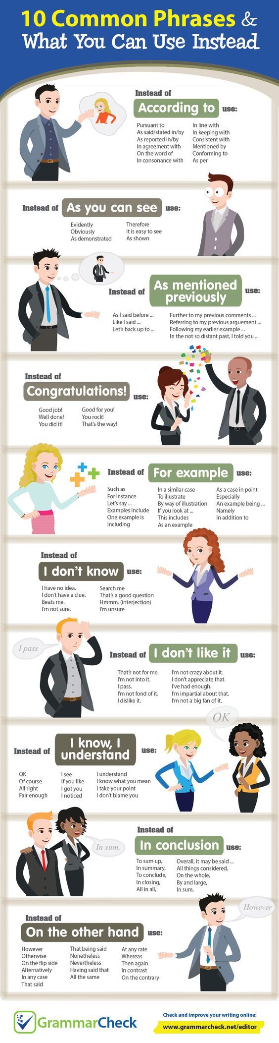 Trong giao tiếp tiếng Anh, có nhiều cụm từ phổ biến thường được sử dụng. Để cách diễn đạt được phong phú hơn, chúng ta hãy cùng tham khảo những cách dùng từ thay thế dưới đây.
