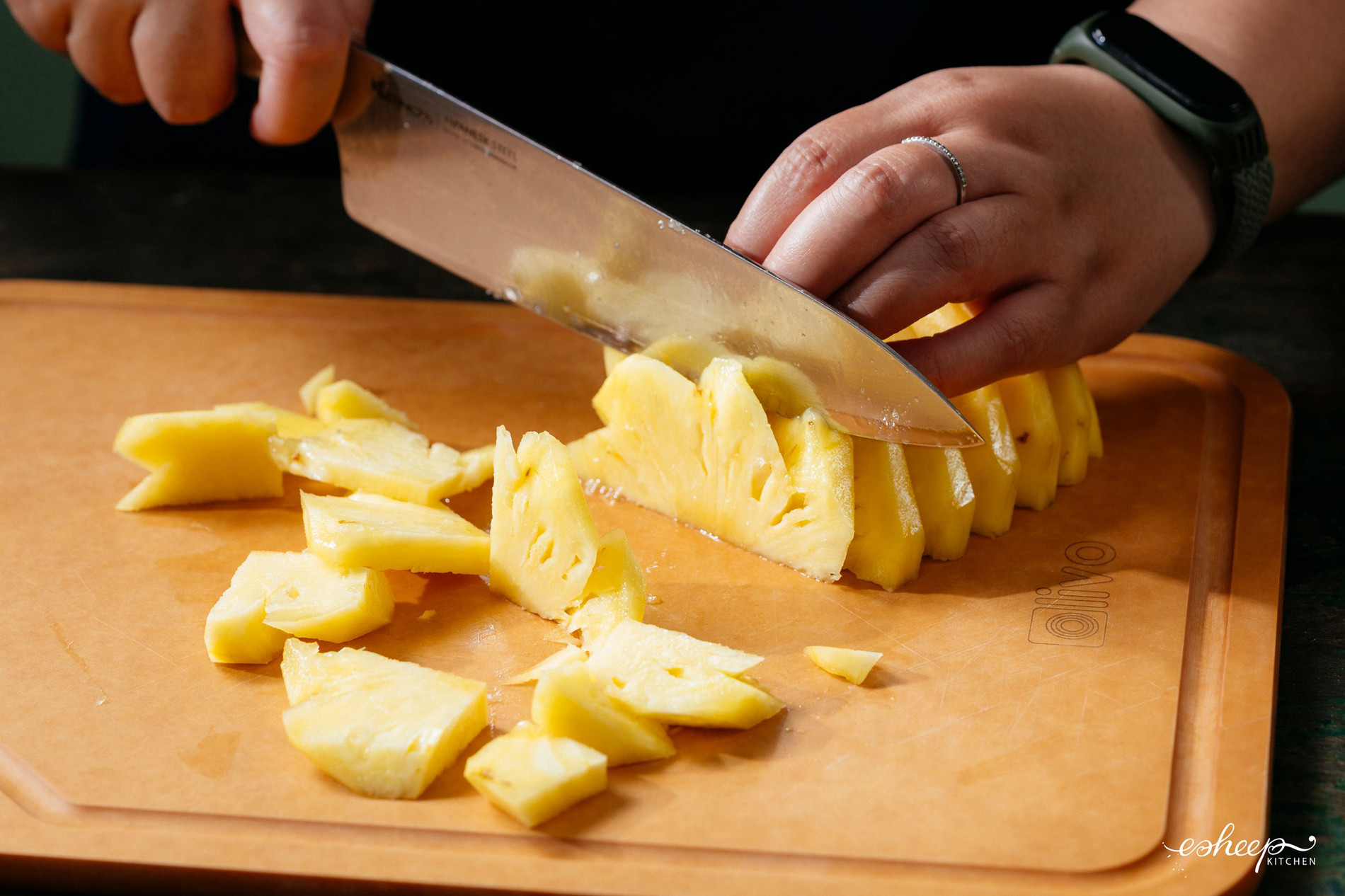 Dứa bổ đôi, thái thành các miếng nhỏ.