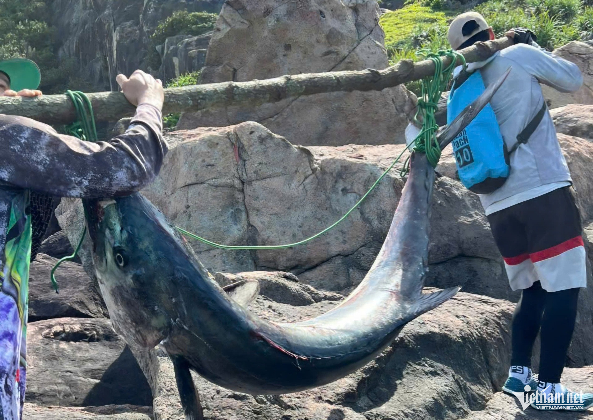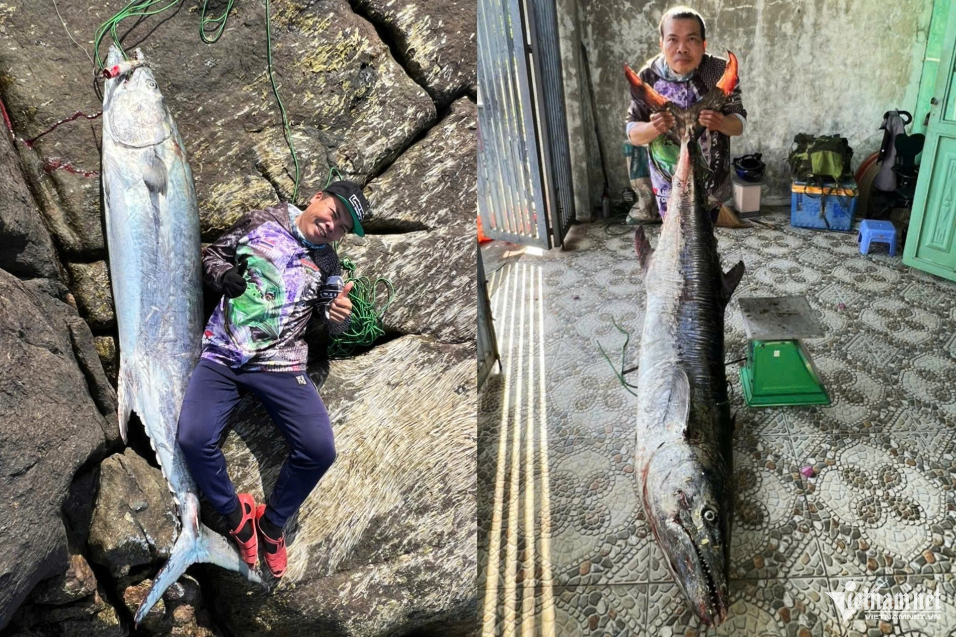 Sau hơn 1 giờ vật lộn căng thẳng trên ghềnh đá bán đảo Sơn Trà, cần thủ Đà Nẵng đã câu được con cá thu nặng 63kg và cùng bạn bè khiêng qua hơn 300m đường núi để đưa “chiế...