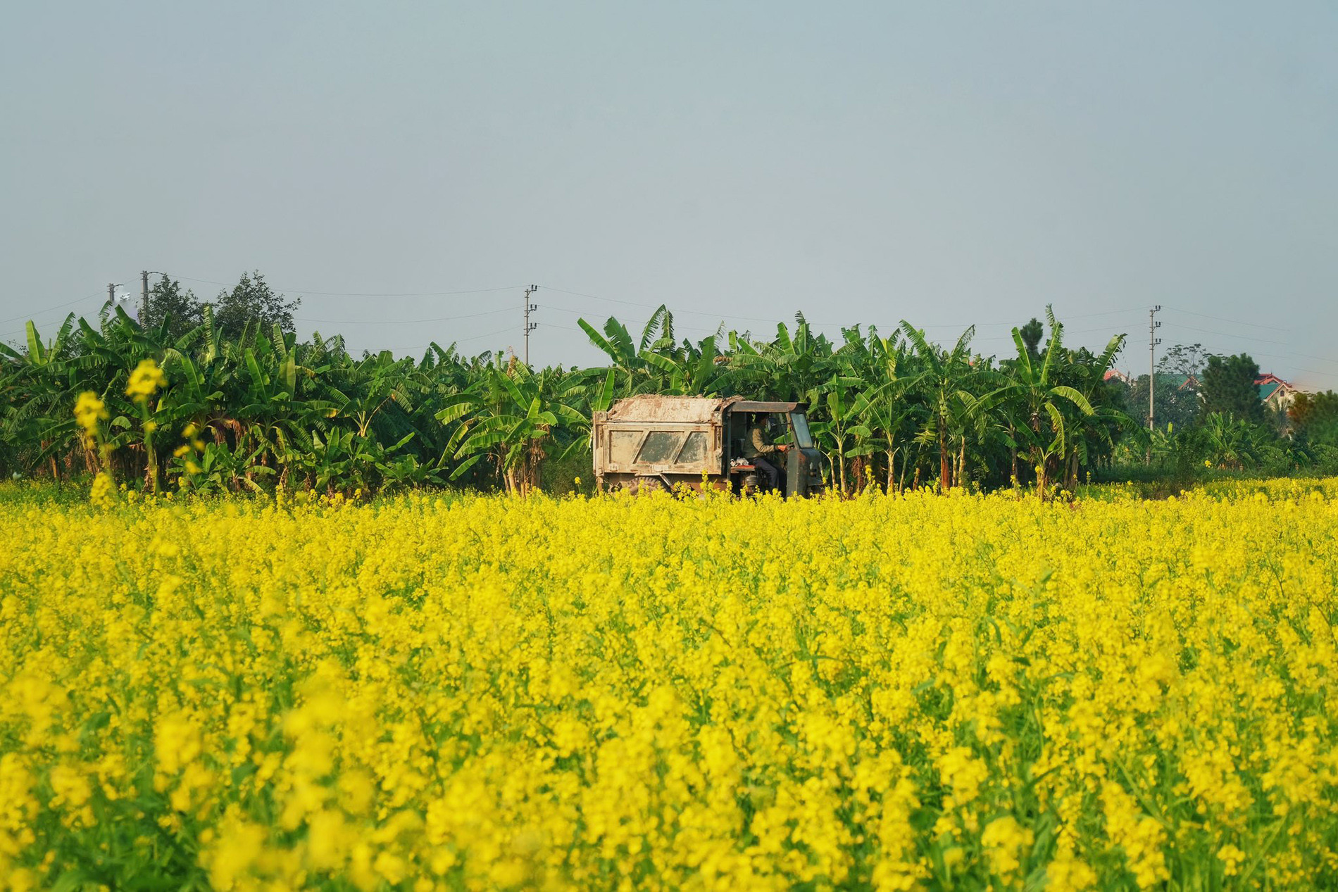 Thời điểm này, hoa cải vàng ở đây nở rộ, tỏa sắc vàng ươm, góp phần tô điểm hương sắc cho vùng đất giáp ranh giữa Hà Nội với Bắc Ninh.
