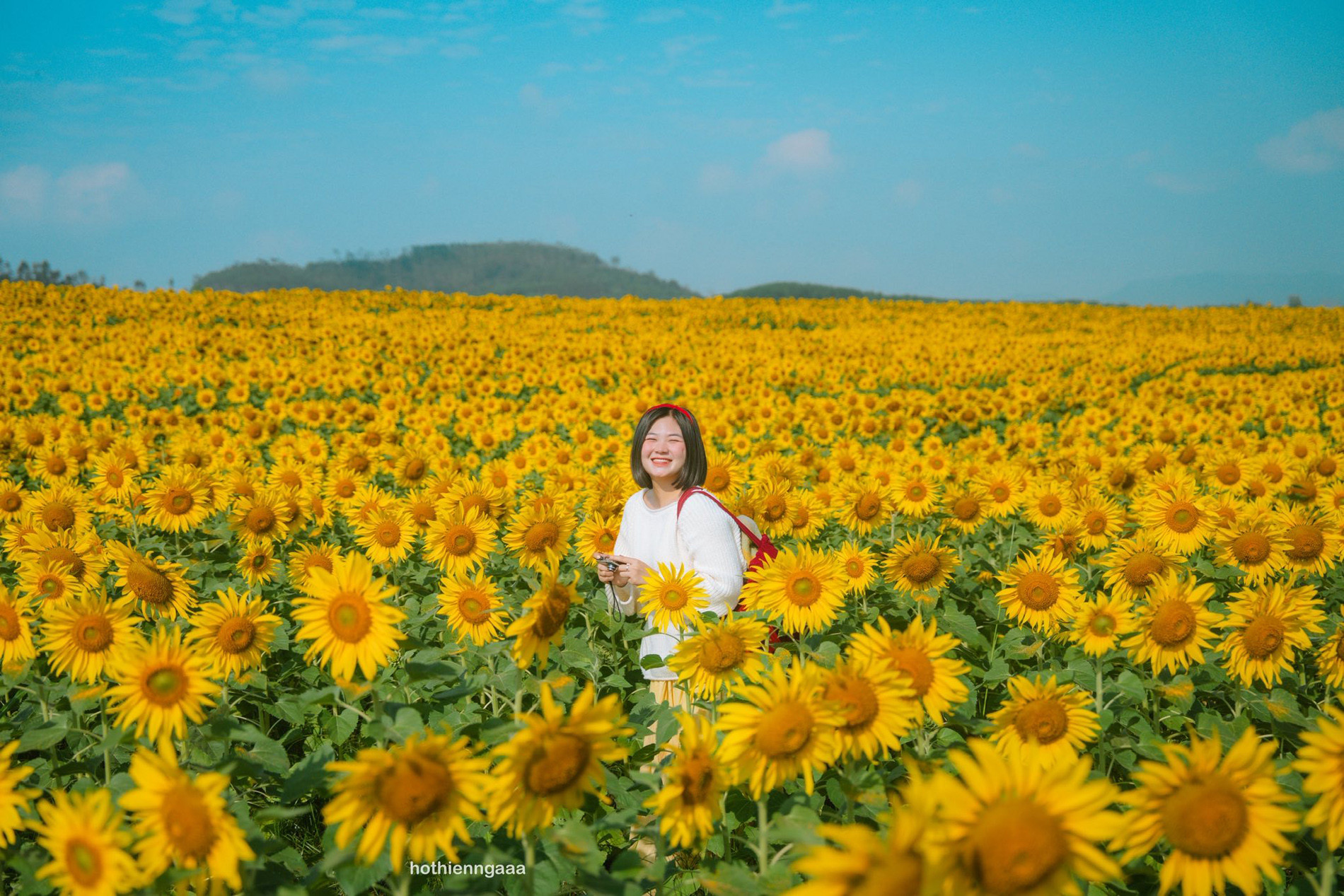 Theo kinh nghiệm của cô gái trẻ, thời điểm lý tưởng để chụp hình đẹp ở cánh đồng hoa hướng dương là vào buổi sáng, khoảng từ 8h đến 10h. Lúc này, nắng dịu nhẹ, thời tiết mát mẻ, dễ chịu, thuận tiện cho du khách tham gia các hoạt động, trải nghiệm ngoài trời.