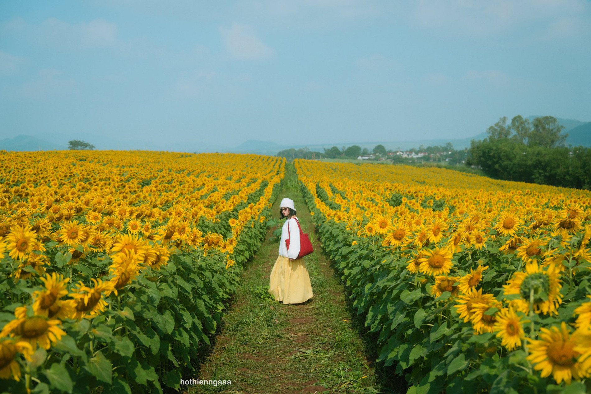 Thiên Nga cũng gợi ý, du khách tới đây nên chọn trang phục có tông màu sáng rực như trắng, đỏ, hồng… để trở nên nổi bật và có những bức hình thật đẹp giữa cánh đồng hoa màu vàng, bầu trời màu xanh.