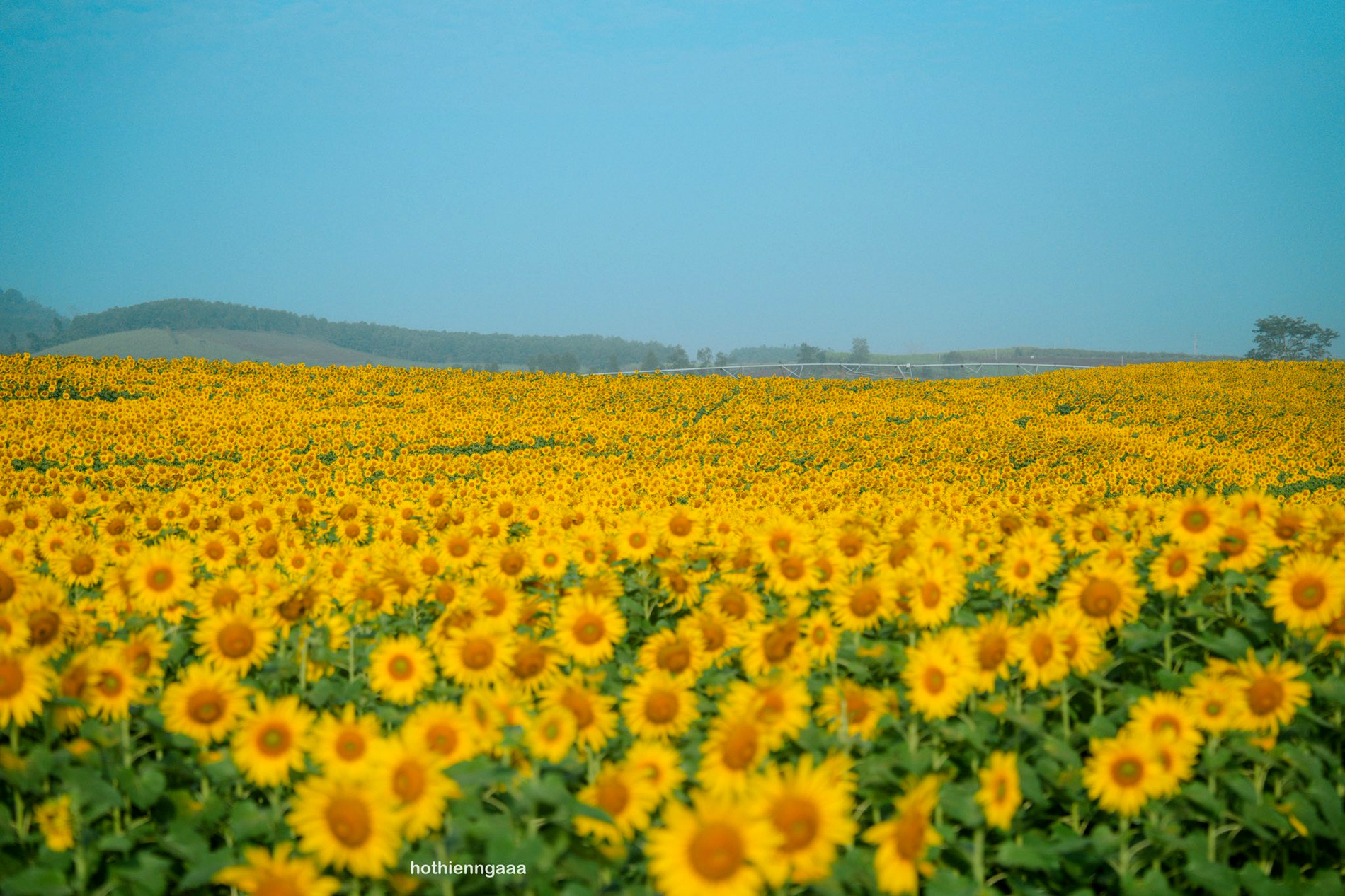 Thời điểm này, hoa hướng dương ở đây nở rộ, tỏa sắc vàng rực rỡ làm sáng bừng cả một vùng, tạo khung cảnh lãng mạn, đẹp như tranh.