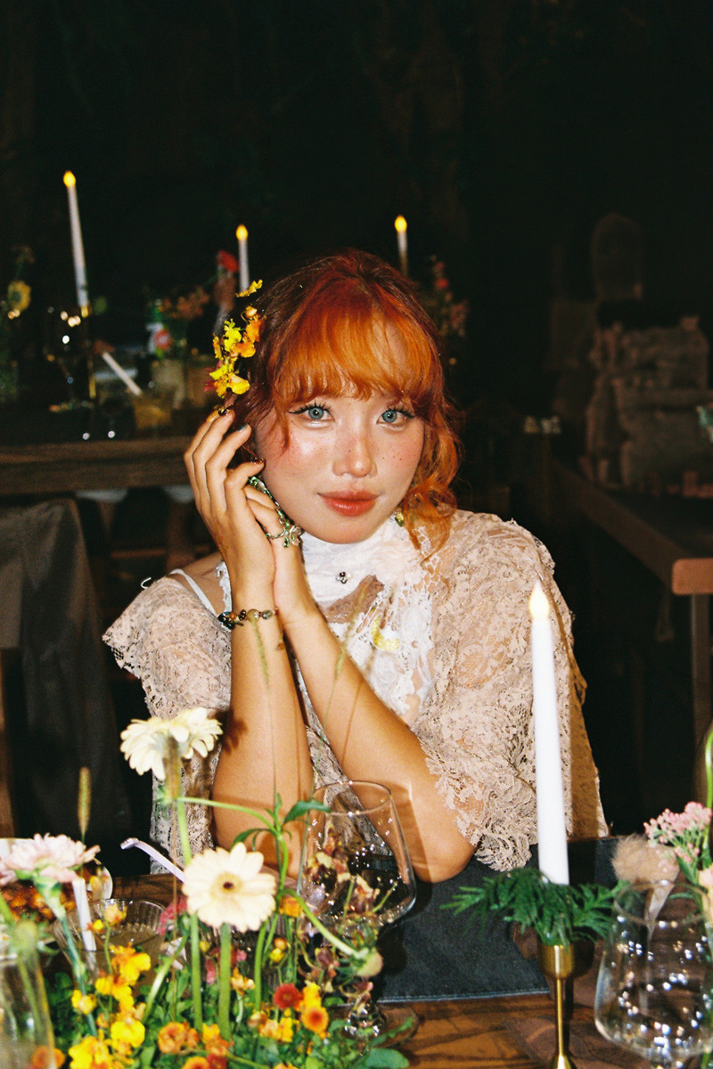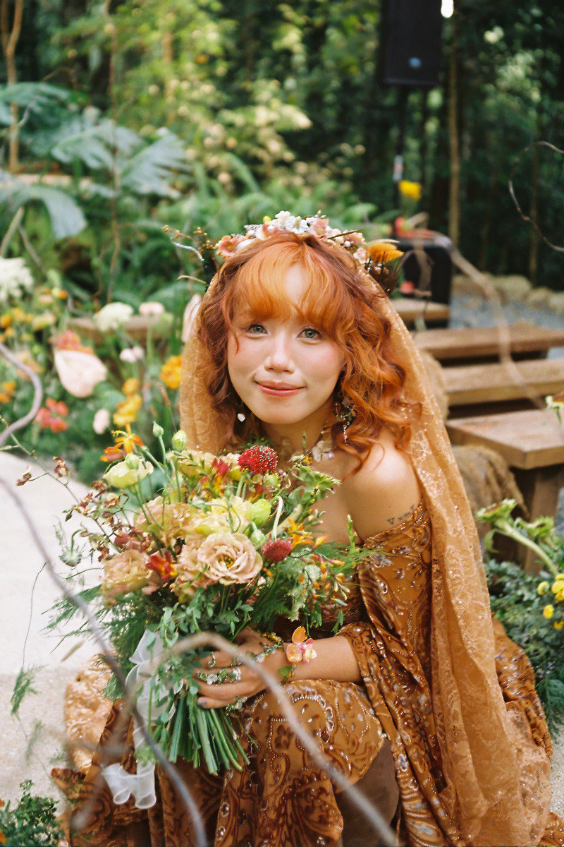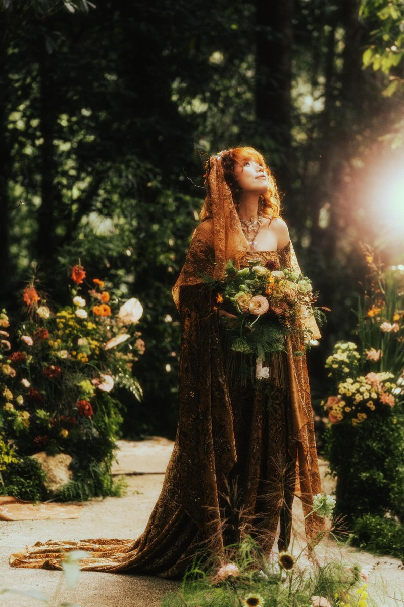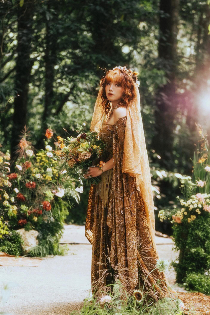 Trong hôn lễ, cô dâu không mặc váy cưới trắng mà khoác lên mình 2 chiếc váy với phong cách lạ. Khi làm lễ, cô dâu mặc váy màu nâu, đầu đội vương miện làm từ hoa dại.