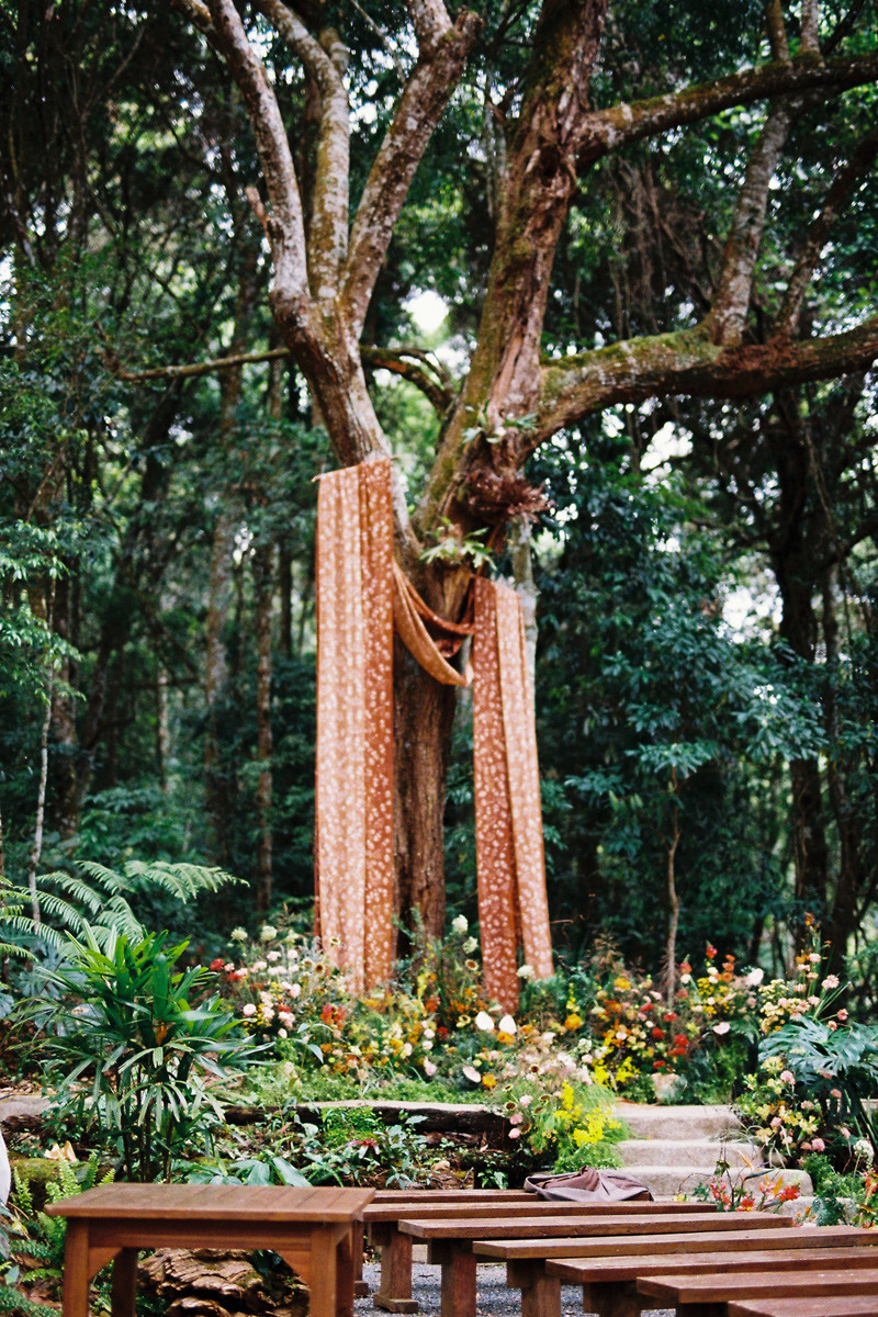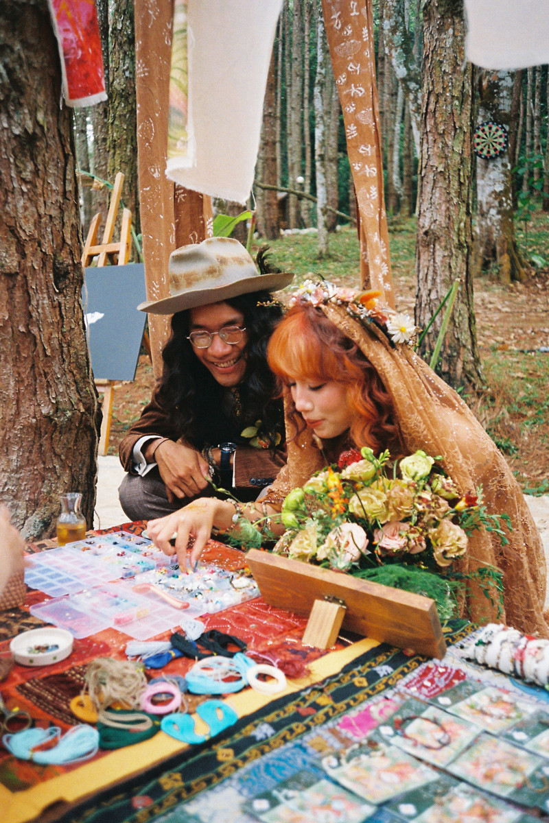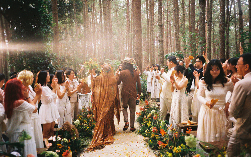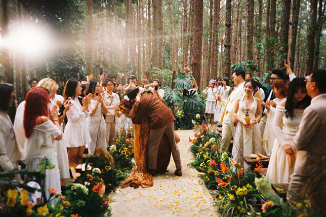 Hôn lễ của Vy được tổ chức trong 6 tiếng đồng hồ, từ chiều đến tối muộn. Không có những nghi thức thông thường trong các đám cưới truyền thống, 40 vị khách mời - là những người bạn thân thiết - được chứng kiến cô dâu, chú rể đọc lời thề nguyện, dự tiệc, tham gia “phiên chợ thu nhỏ” với các hoạt động thắt vòng tay, vẽ Henna, thưởng thức nhạc, nhảy múa tự do giữa rừng thông...
