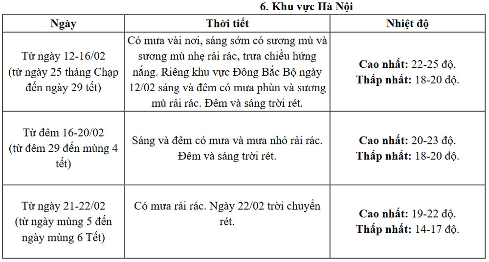Đáng lưu ý, thời kỳ từ đêm 16-20/2 (tức đêm 29 đến mùng 4 Tết), miền Bắc có mưa và mưa nhỏ rải rác vào sáng và đêm; riêng khu Tây Bắc có mưa vài nơi; đêm và sáng trời rét. Dự báo, mức nhiệt cao nhất những ngày này ở Bắc Bộ khoảng 19-23 độ; riêng khu Tây Bắc có nơi trên 26 độ; thấp nhất 17-20 độ, vùng núi có nơi dưới 16 độ.