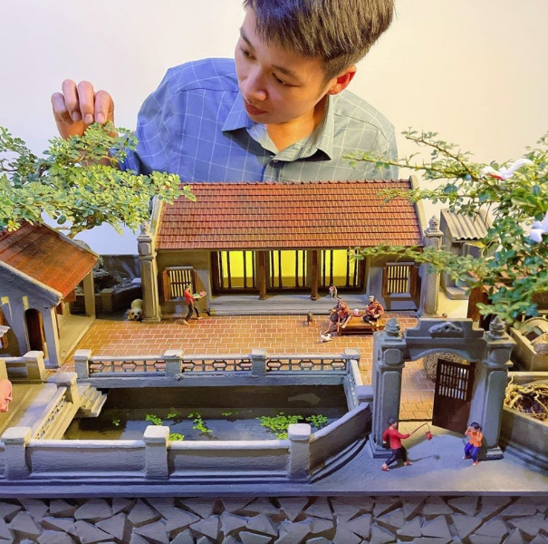 Qua bàn tay khéo léo của chàng trai 32 tuổi, mô hình tiểu cảnh hiện lên đầy sống động. Những căn nhà mái ngói nhuốm rêu phong; những chiếc cổng làng, cổng nhà với kiến trúc xưa cũ; những cây đa, giếng nước, sân đình... tất cả đều gợi nhớ đến hình ảnh làng quê vùng nông thôn Bắc Bộ.