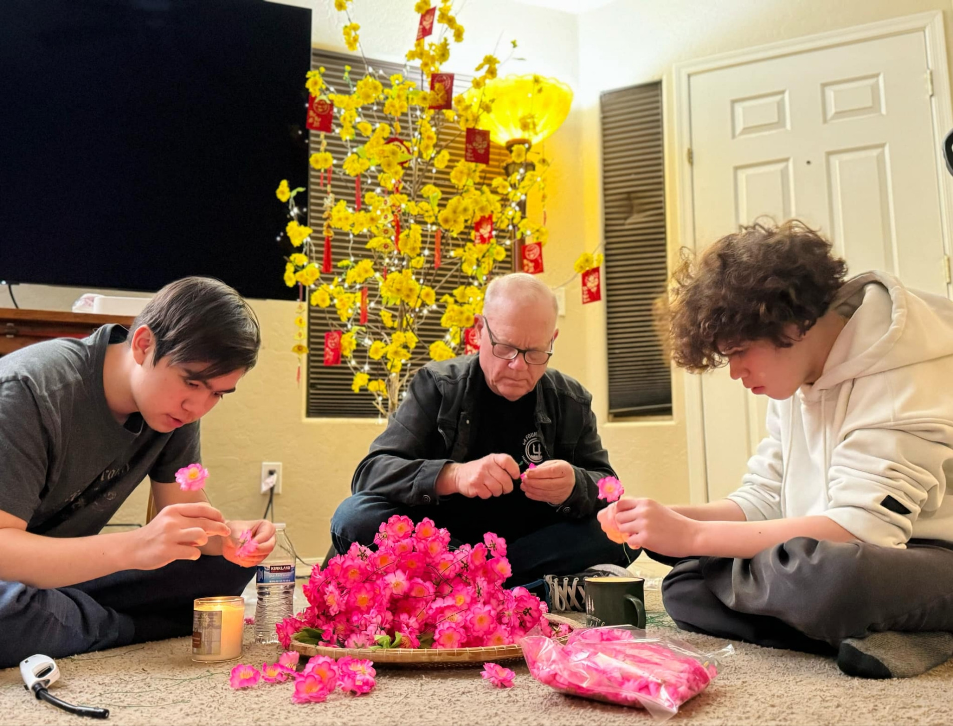 Những ngày cận Tết, ông và 2 con trai tranh thủ tận dụng cây khô làm thành tiểu cảnh mai đào, giúp vợ dọn dẹp nhà cửa…
