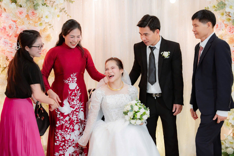 Trong lễ vu quy, Ngân khoác trên mình chiếc váy cưới lộng lẫy, ngồi trên chiếc xe lăn quen thuộc được người thương đẩy vào lễ đường.