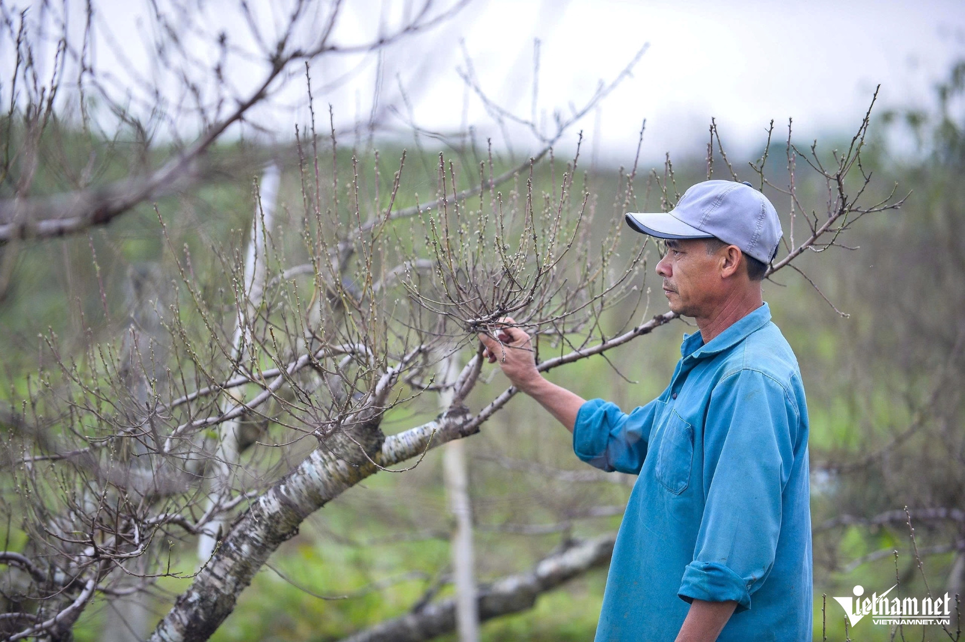 Ông Quyết đang chăm sóc vườn đào của gia đình. Ảnh: Lê Dương