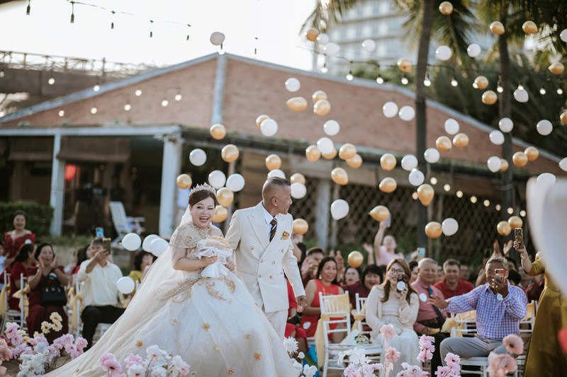 Đám cưới của cặp đôi được tổ chức tại quê nhà hai bên và ở Mỹ - nơi họ đang sinh sống, làm việc. Tại đám cưới được tổ chức ở TPHCM, quan khách “choáng ngợp” bởi sính lễ "khủng" gồm tiền mặt, vàng miếng, kiềng vàng và nhiều loại trang sức quý giá. Trong đó, bó hoa cưới được đúc từ 11 cây vàng ròng gây chú ý hơn cả.
