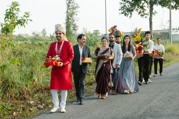 Chú rể Abhishek, bố mẹ và các em dẫn đầu đoàn đón dâu, trong lễ cưới ở Cần Thơ hôm 9/11. Ảnh: Nguyễn Minh Trí