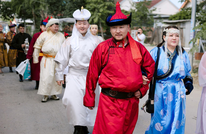 Trong ảnh, chú rể người Mông Cổ mặc trang phục truyền thống cùng bố mẹ, gia đình đến nhà gái hỏi cưới.