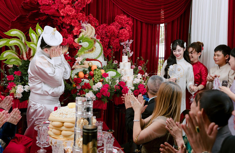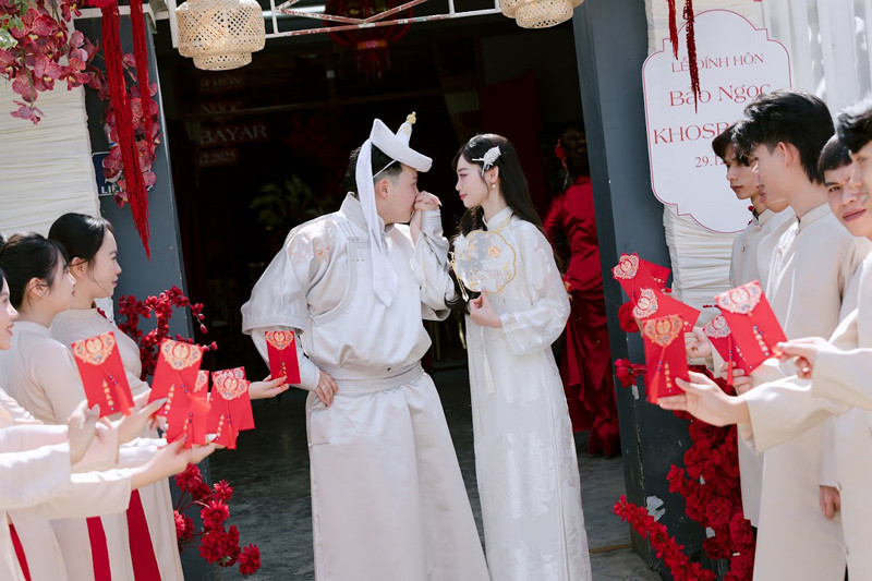 Tôn trọng phong tục cưới hỏi truyền thống của người Việt, chú rể mang sính lễ và các tráp trầu cau, bánh trái được thiết kế đẹp mắt đến nhà gái. Cô dâu diện áo dài truyền thống, cùng chú rể thực hiện nhiều nghi thức như lễ gia tiên, lễ xin dâu, tri ân hai bên cha mẹ.