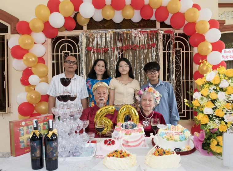 “Cả nhà cùng chung ý tưởng tổ chức lễ kỷ niệm 60 năm ngày cưới thật hoành tráng cho ông bà. Khi đã thống nhất ý kiến, mỗi người đứng ra chuẩn bị một công đoạn, người thì đặt cỗ, người thì làm rạp, người chuẩn bị trang phục, người cắm hoa, bơm bóng bay...