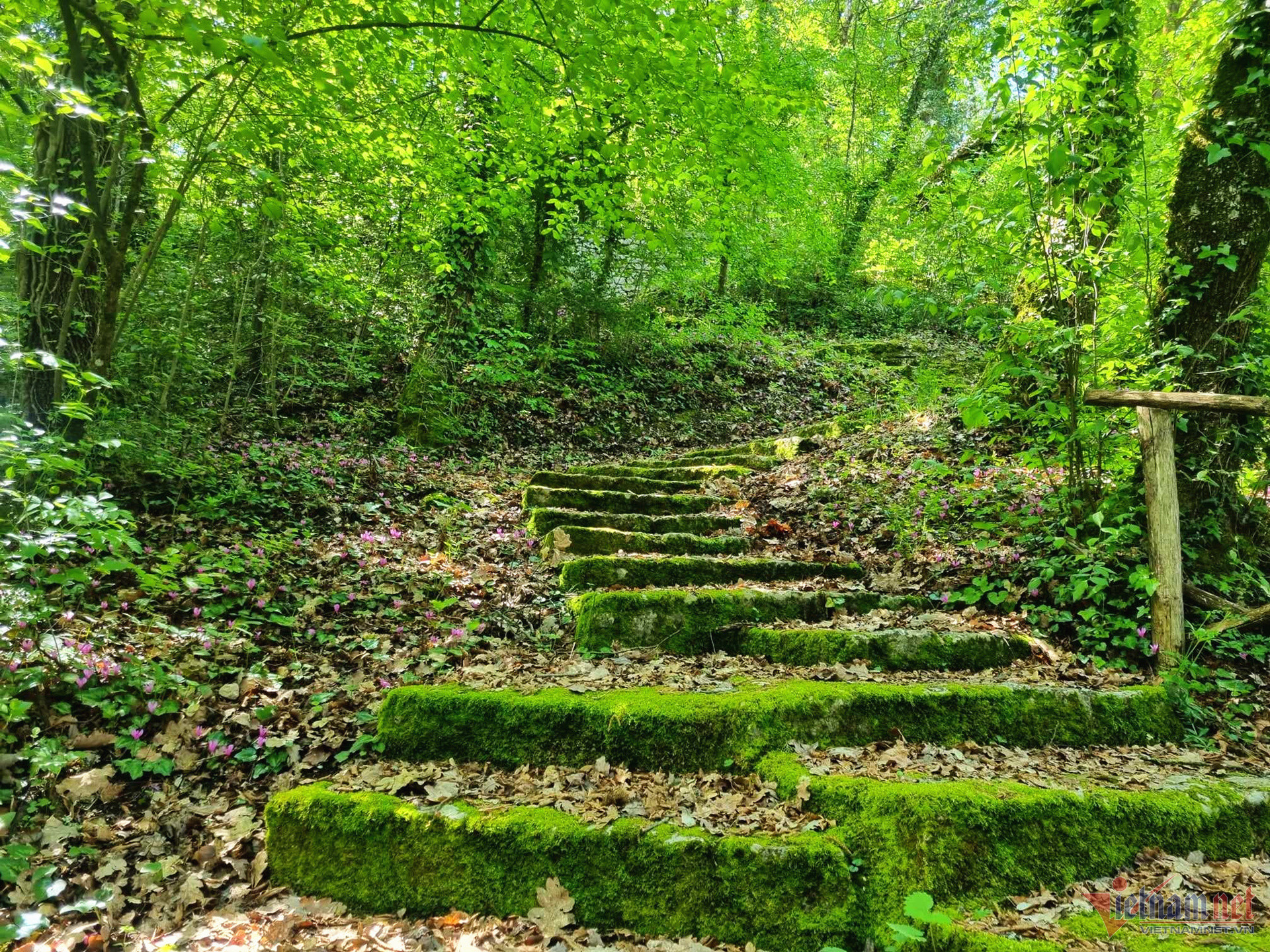 Từ nhà Linh Huyền xuống thành phố chỉ mất khoảng 10 phút đi đường mòn và các bậc thang xanh rêu. Mùa thu, hai bên đường rụng đầy lá vàng, đỏ, có thể nằm dài xuống thảm lá rất êm.