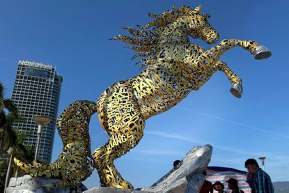 Xuất hiện bên bờ sông Hàn, linh vật ngựa sắt cao 4m nhanh chóng thu hút sự chú ý khi toàn bộ thân được ghép từ tên 94 xã, phường, đặc khu ở Đà Nẵng.