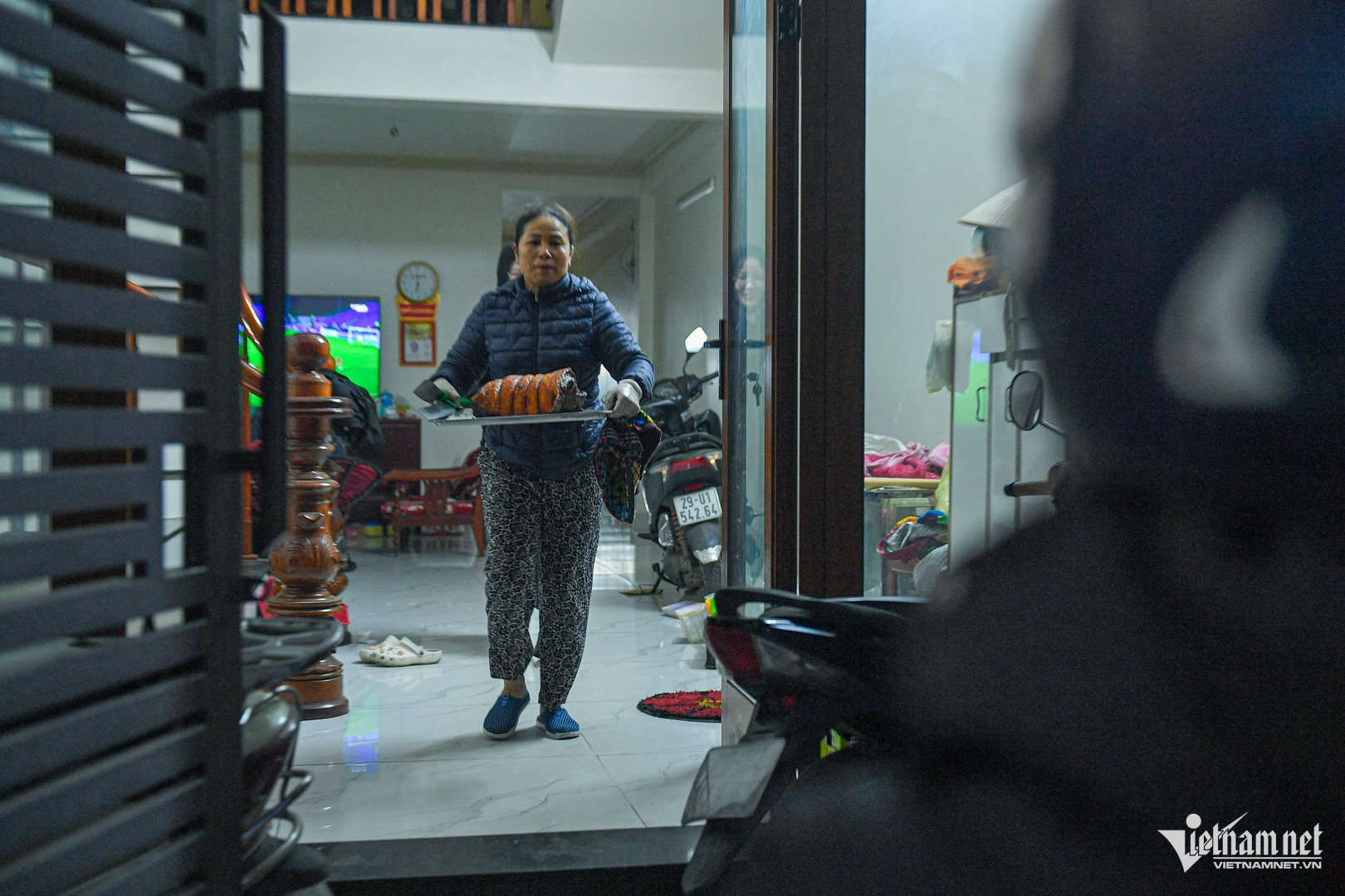 Đã quen thuộc với lịch quay thịt của gia đình bà Hương nên từ 6h, nhiều vị khách trong làng đã đứng sẵn chờ mua, dù thời tiết lạnh sâu, chỉ 12-13 độ C. Ngày cuối tuần, chỉ mở bán 1-1,5 tiếng, toàn bộ số thịt quay đều hết sạch.