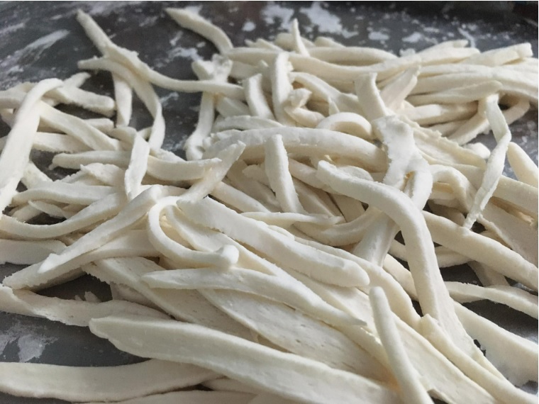 Bột nhào xong, người ta dùng ống tre hoặc chày gỗ, chai thủy tinh cán thật mỏng rồi thái thành những sợi dài vừa ăn.