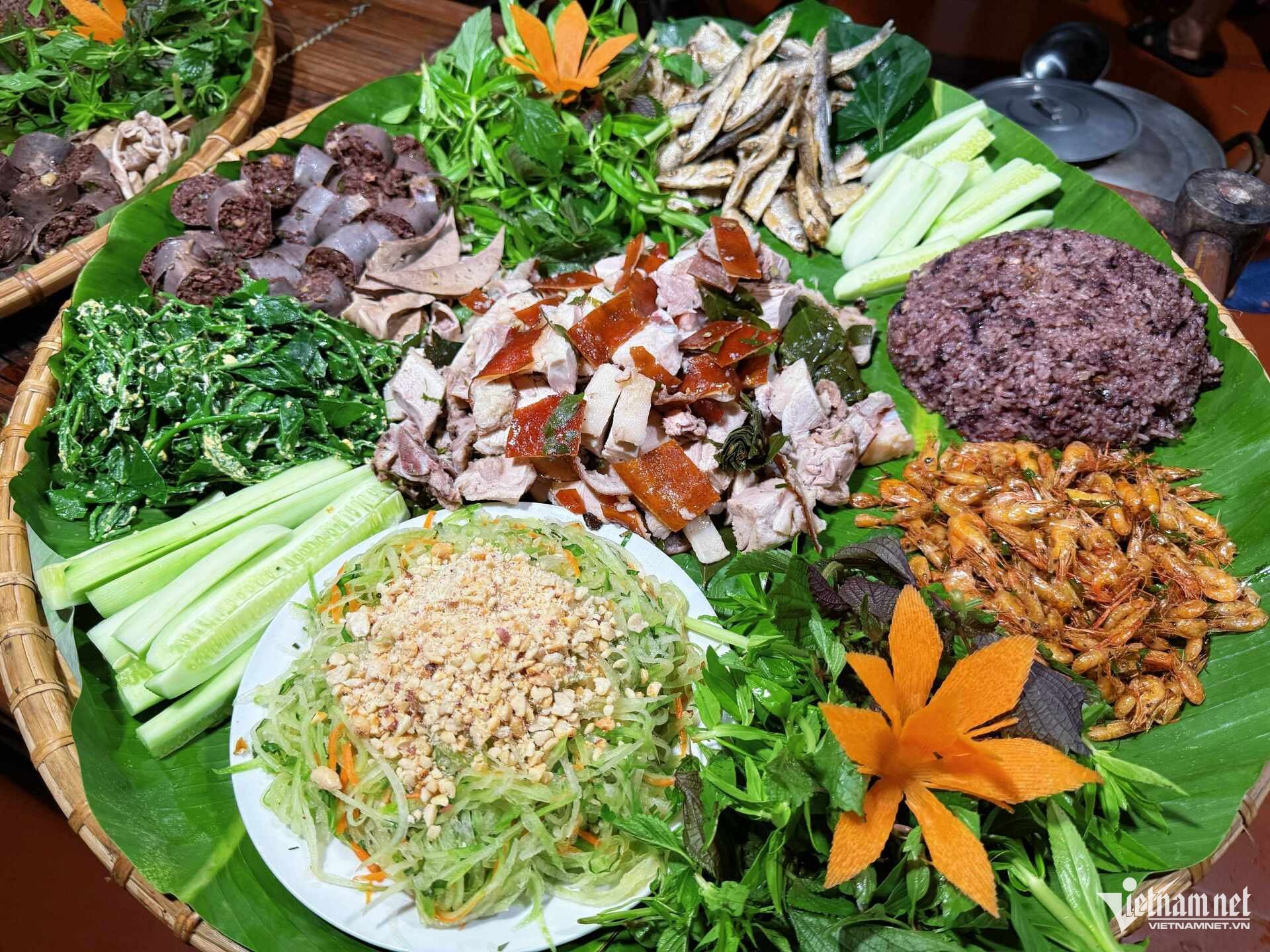 Mâm cơm mời khách ở đây thường không thể thiếu thịt lợn quay, xôi trám, khâu nhục, cá suối chiên giòn, tôm hồ rang lá chanh... và các món chế biến từ đặc sản bí xanh thơm.