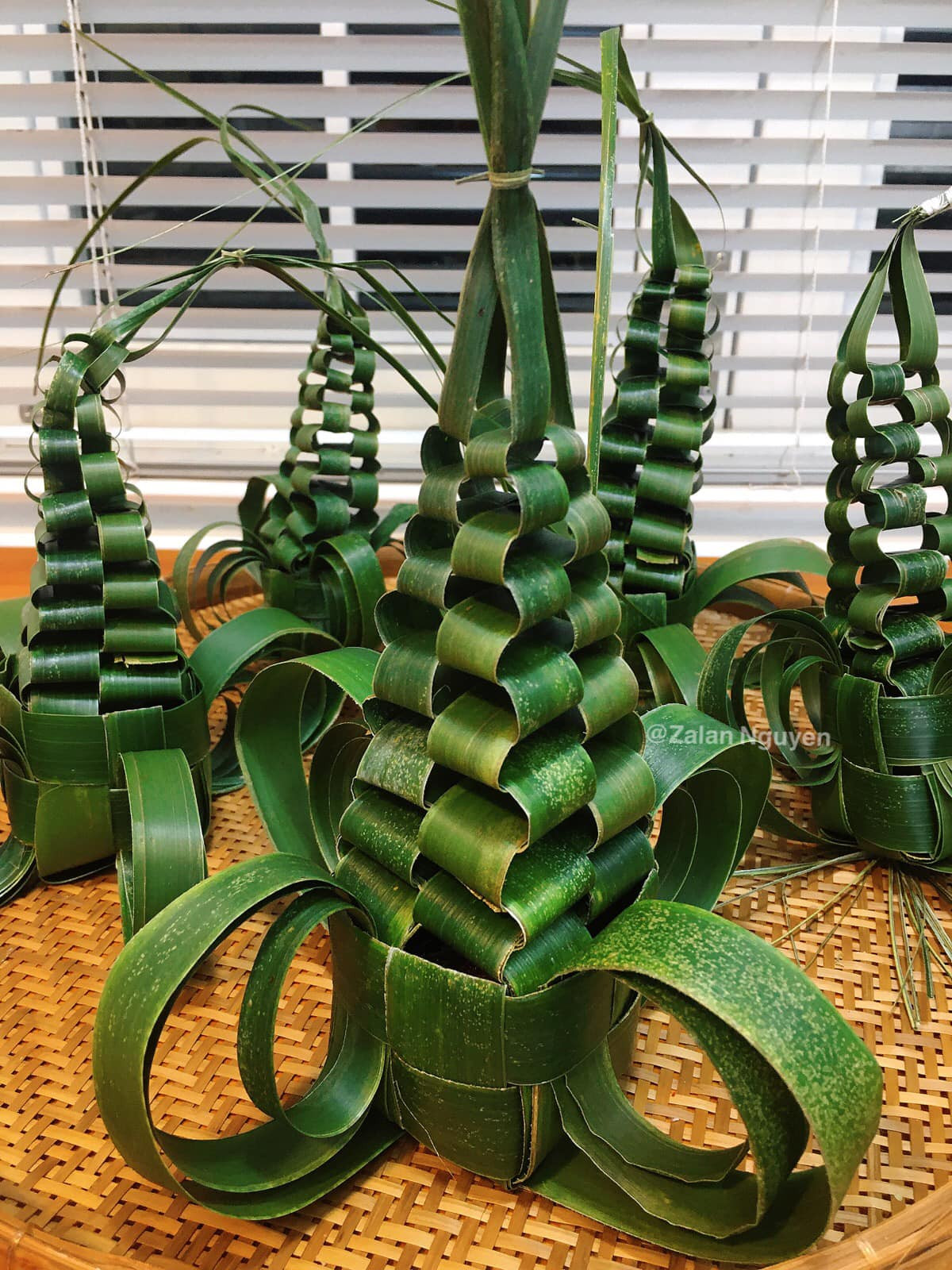 Theo đó, bà con sẽ dùng lá dừa (lá dừa già hoặc non đều được) rồi đan lại thành hình chiếc lầu, bên trên có nhiều tầng và phía dưới là một ngăn rỗng ruột để đựng nem.