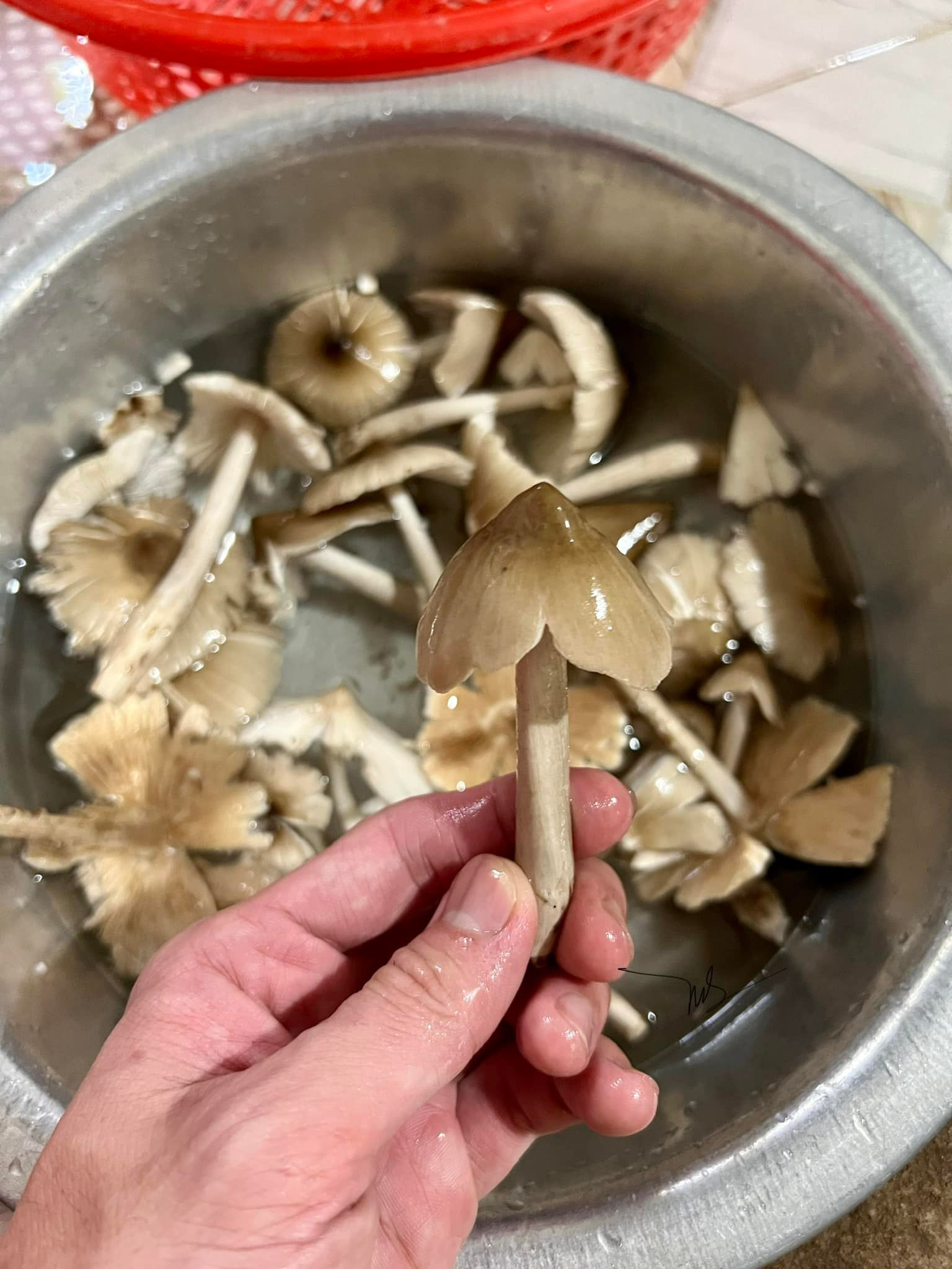 Nấm mối hái về chỉ cần gọt bỏ phần dính đất, ngâm nước muối và rửa sạch nhẹ nhàng, tránh để nấm vỡ hay bị nát, mất chất ngọt. Nấm sơ chế sạch là có thể chế biến món ăn.