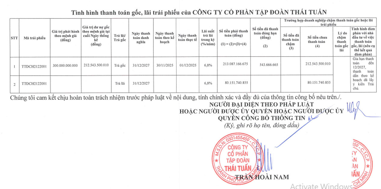 Lô trái phiếu TTDCH2122001 có tổng giá trị phát hành theo mệnh giá là 300 tỷ đồng. Tập đoàn Thái Tuấn chưa thanh toán hơn 212,5 tỷ đồng tiền gốc và gần 80,2 tỷ đồng tiền lãi. Trong 11 tháng, Thái Tuấn chỉ trả được gần 544 triệu đồng tiền gốc.