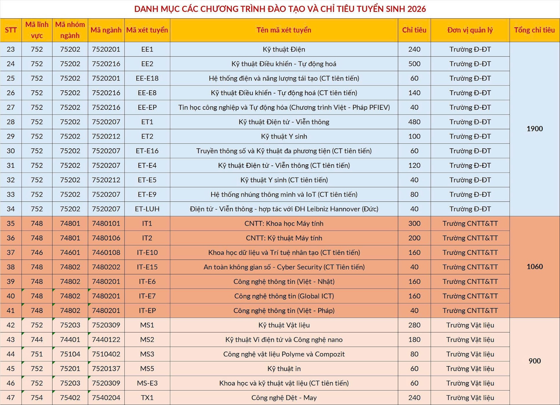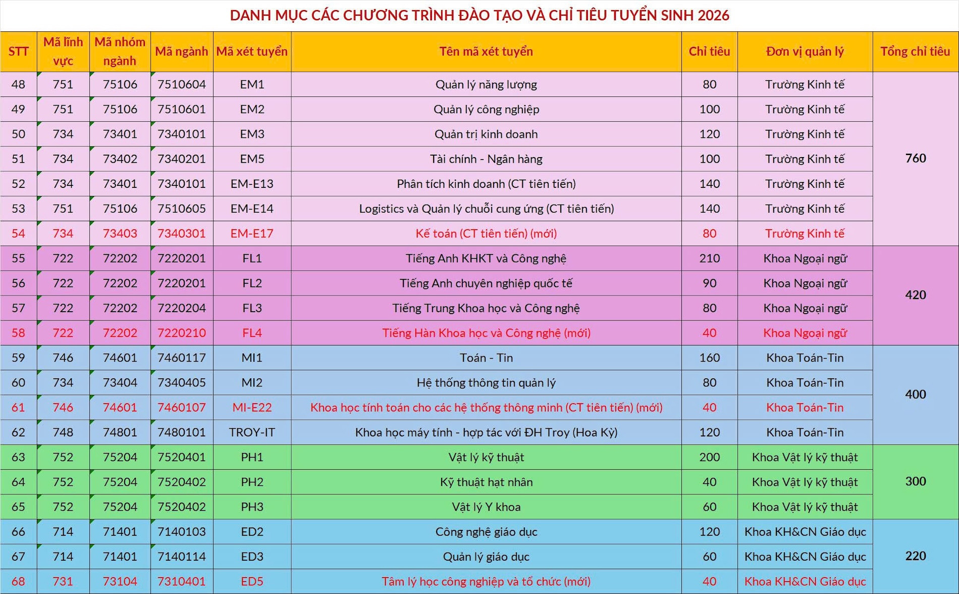 Danh mục các chương trình đào tạo, chỉ tiêu, phương thức và mã xét tuyển cụ thể như sau: