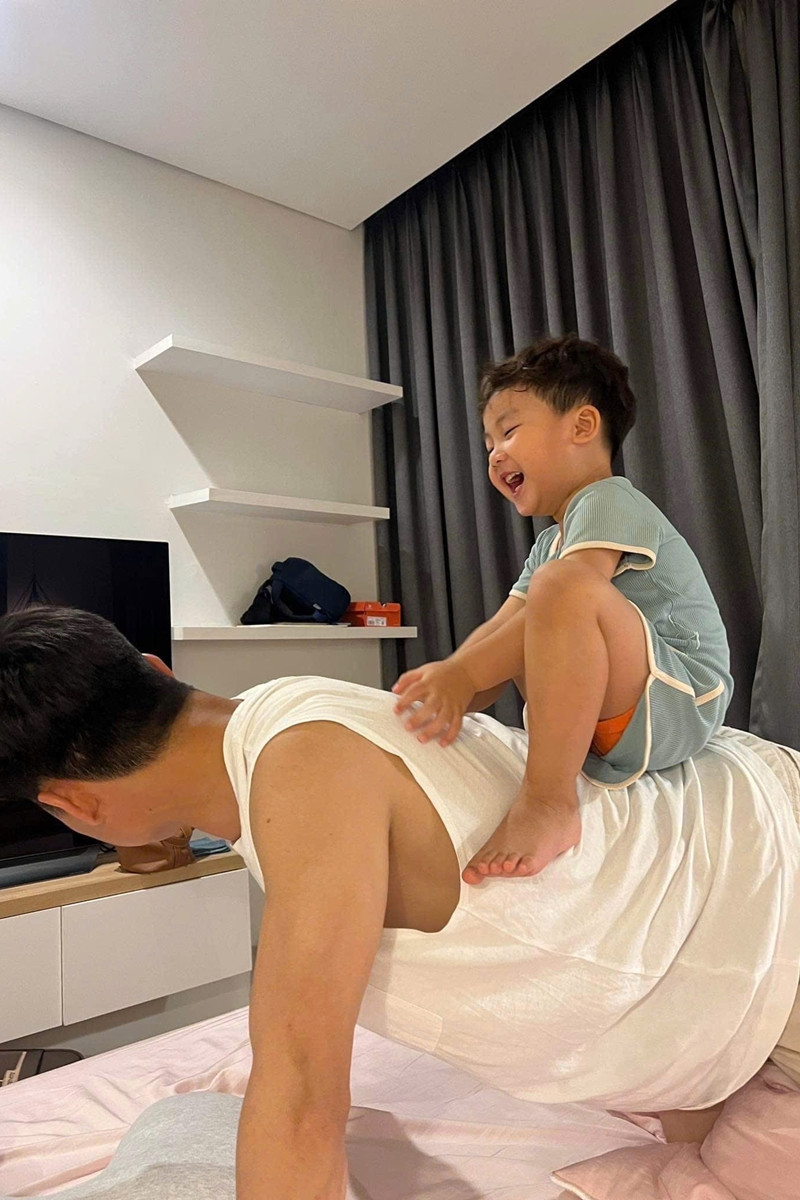 Thăng Văn Cương cũng chia sẻ thêm hình ảnh Hòa Minzy tươi cười ngồi trên vai bạn trai khi cả 2 mặc quân phục với tên in rõ trên áo, bình dị, hồn nhiên và hạnh phúc. Một hình ảnh khác là khi Văn Cương cúi người cho bé Bo leo lên lưng, thể hiện sự gắn bó giữa anh và con trai riêng của Hòa Minzy. Trong bộ quân phục chỉnh tề, Thăng Văn Cương còn ôm chặt bé Bo giữa phòng khách.