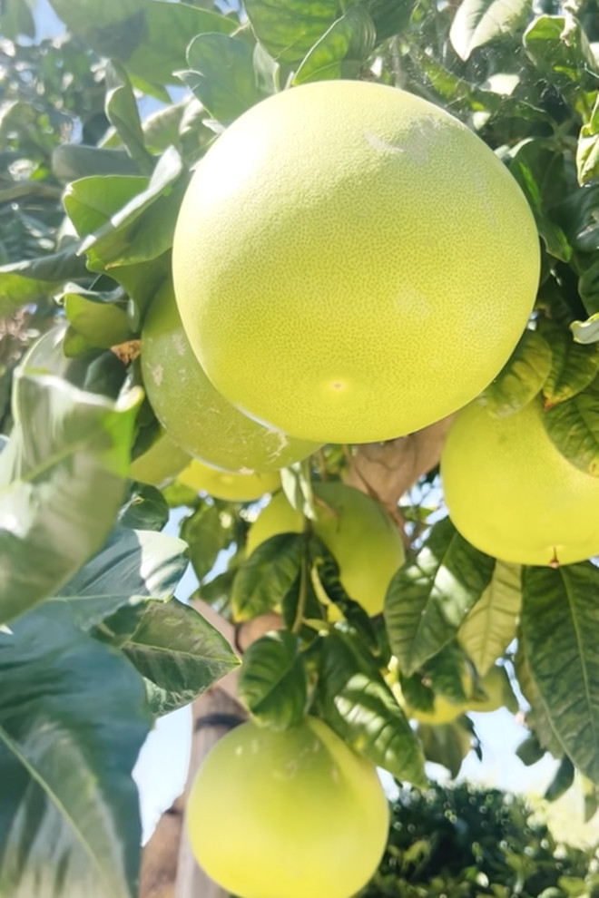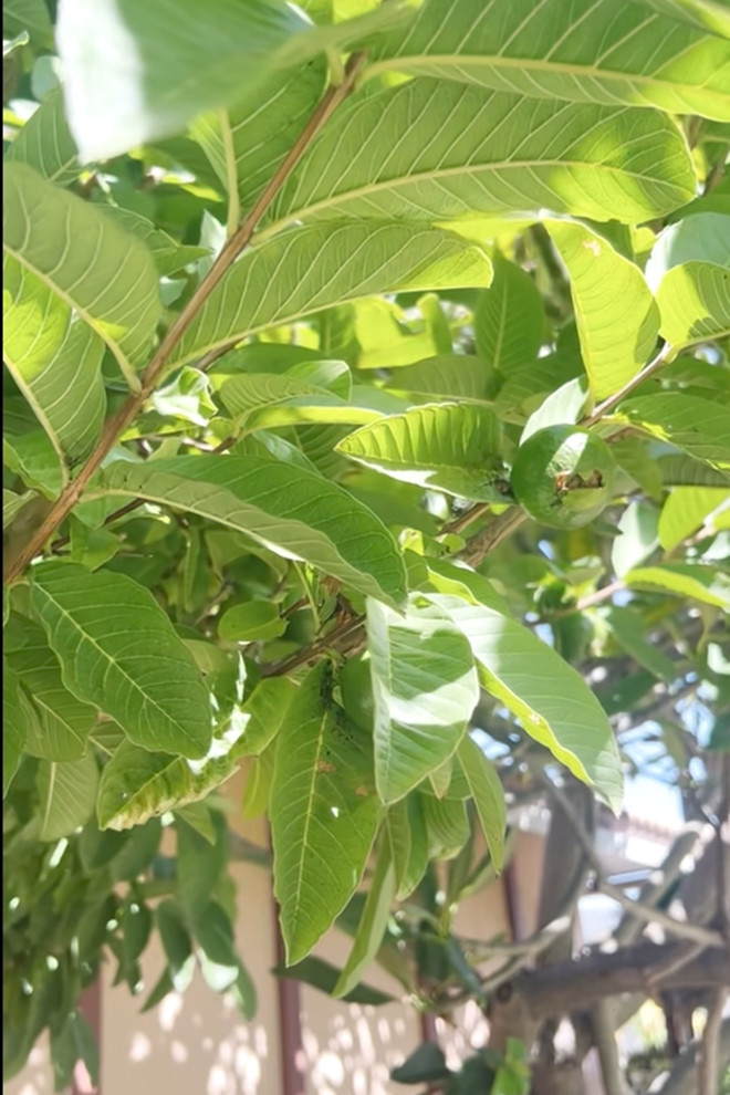 Cây ổi cho trái tuy nhỏ nhưng Thúy Nga khẳng định "chưa từng ăn ổi nào ngon bằng". Năm nay, cây ra trái rất nhiều. Vườn còn có hoa dâm bụt nở đỏ rực, cây bưởi với trái ngọt, giòn và thơm.