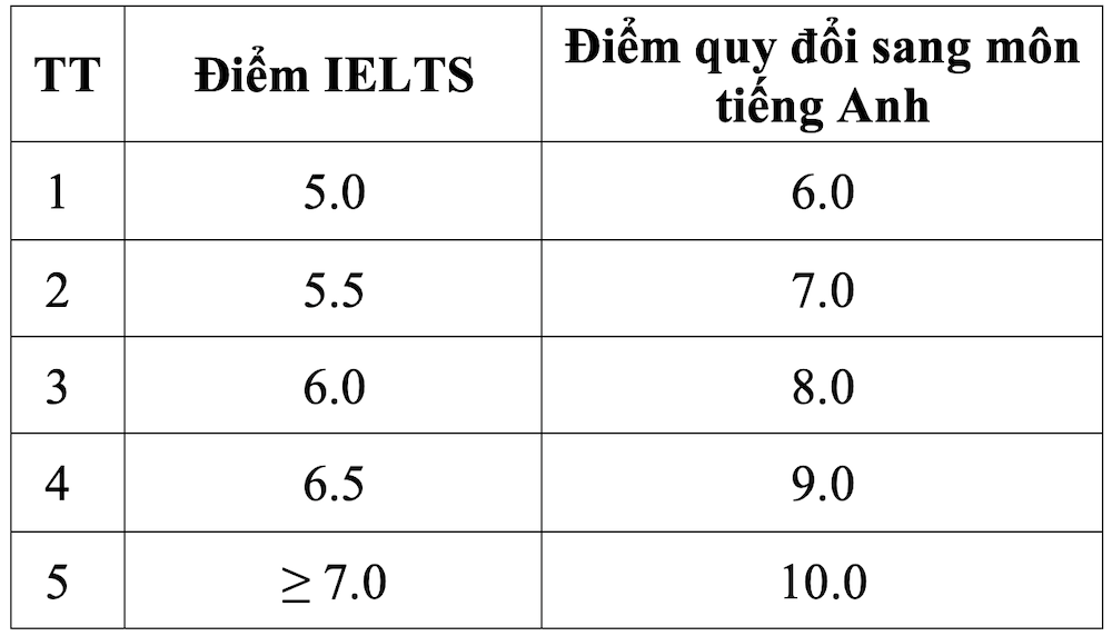 Thí sinh có chứng chỉ tiếng Anh quốc tế IELTS được sử dụng để quy đổi thành điểm môn tiếng Anh khi xét tuyển theo phương thức điểm thi tốt nghiệp THPT năm 2026 (PT3). Quy định này áp dụng đối với thí sinh được miễn thi tốt nghiệp THPT môn tiếng Anh theo Quy chế thi hiện hành. Điểm quy đổi sẽ được tính vào tổ hợp xét tuyển có môn tiếng Anh tương ứng như sau: