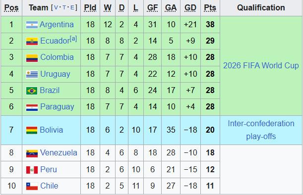 BXH vòng loại World Cup 2026 khu vực Nam Mỹ chung cuộc