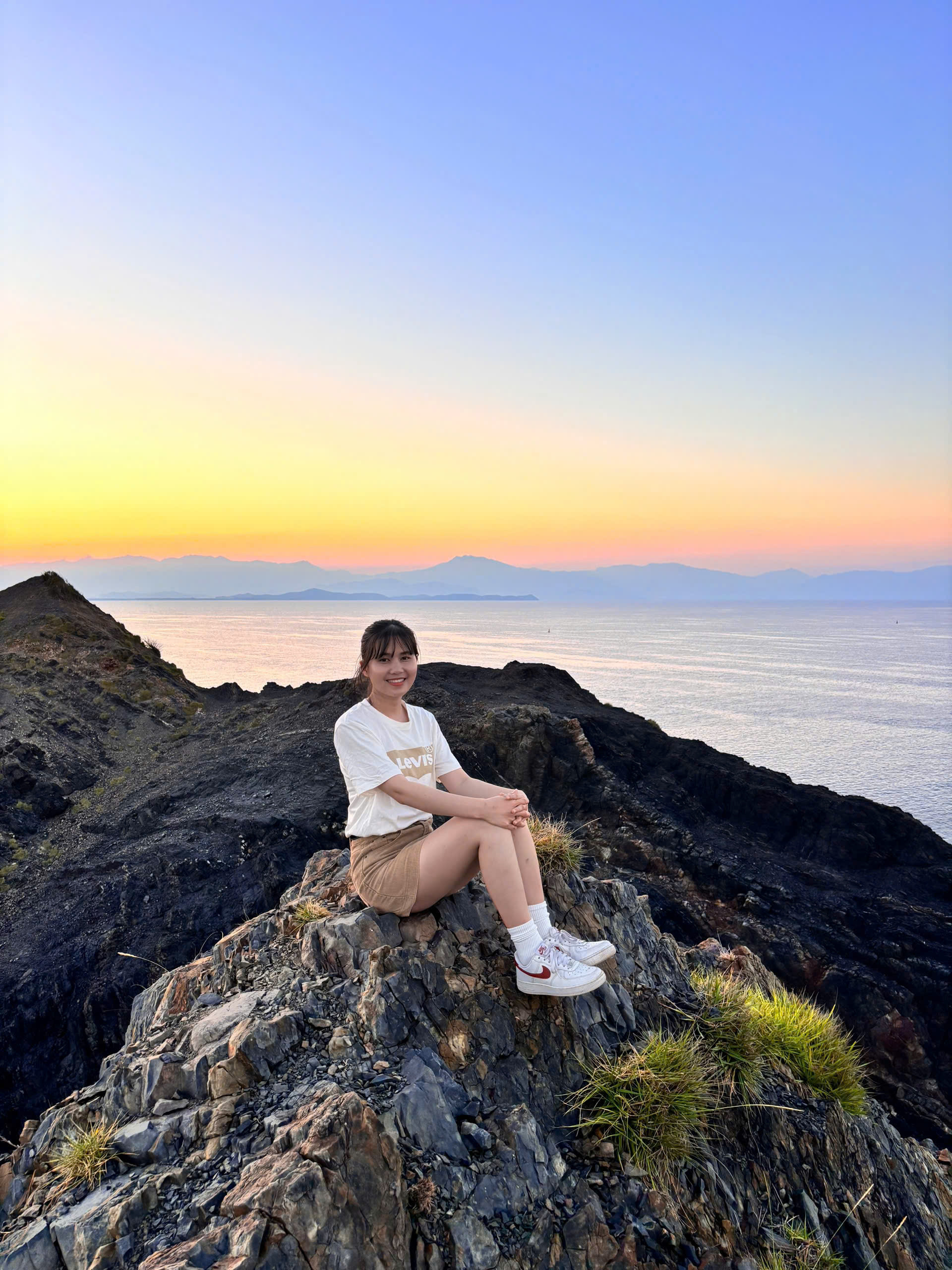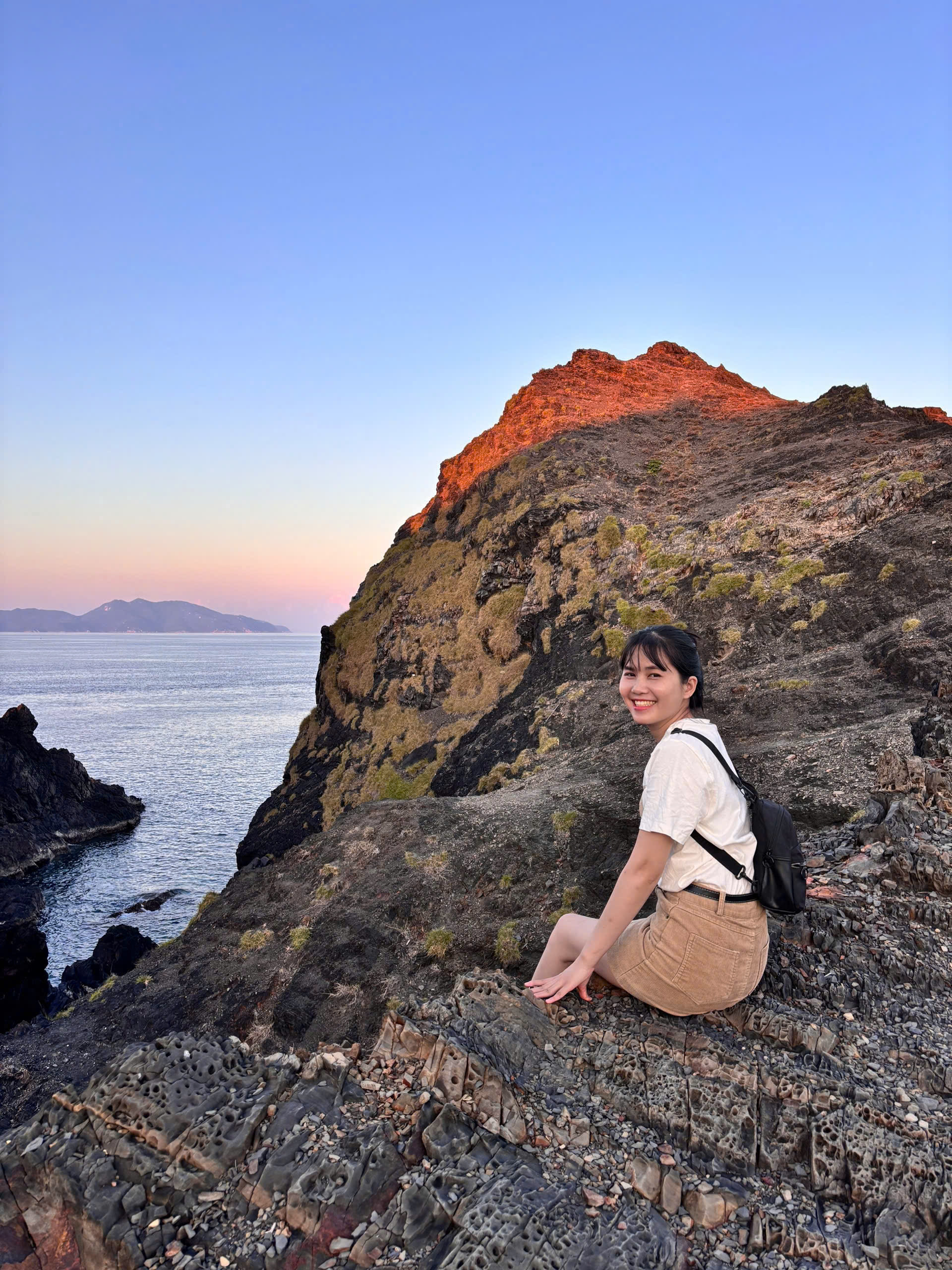 Đặc biệt, khoảnh khắc ngắm hoàng hôn trên “sống lưng khủng long” ở hòn Mỹ Giang để lại ấn tượng mạnh đối với cô, khi khung cảnh vịnh Vân Phong “nhuộm đỏ” dưới nắng chiều.