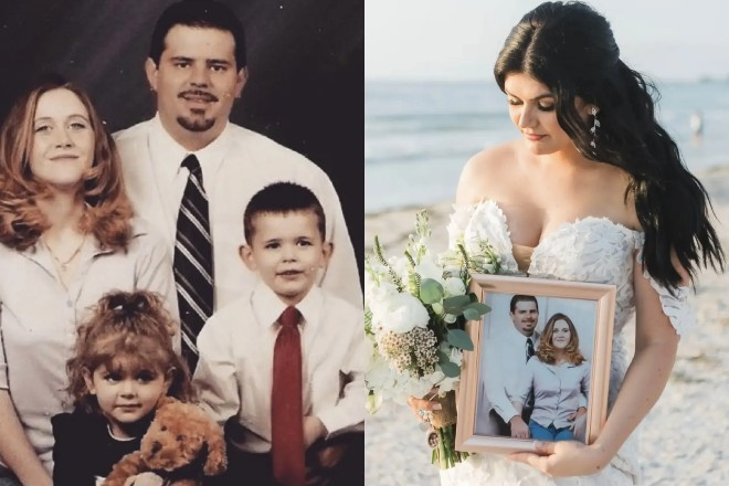 MỸ- Khoảnh khắc lay động hàng triệu trái tim khi cô dâu mang theo ảnh bố mẹ đã mất vào lễ đường.