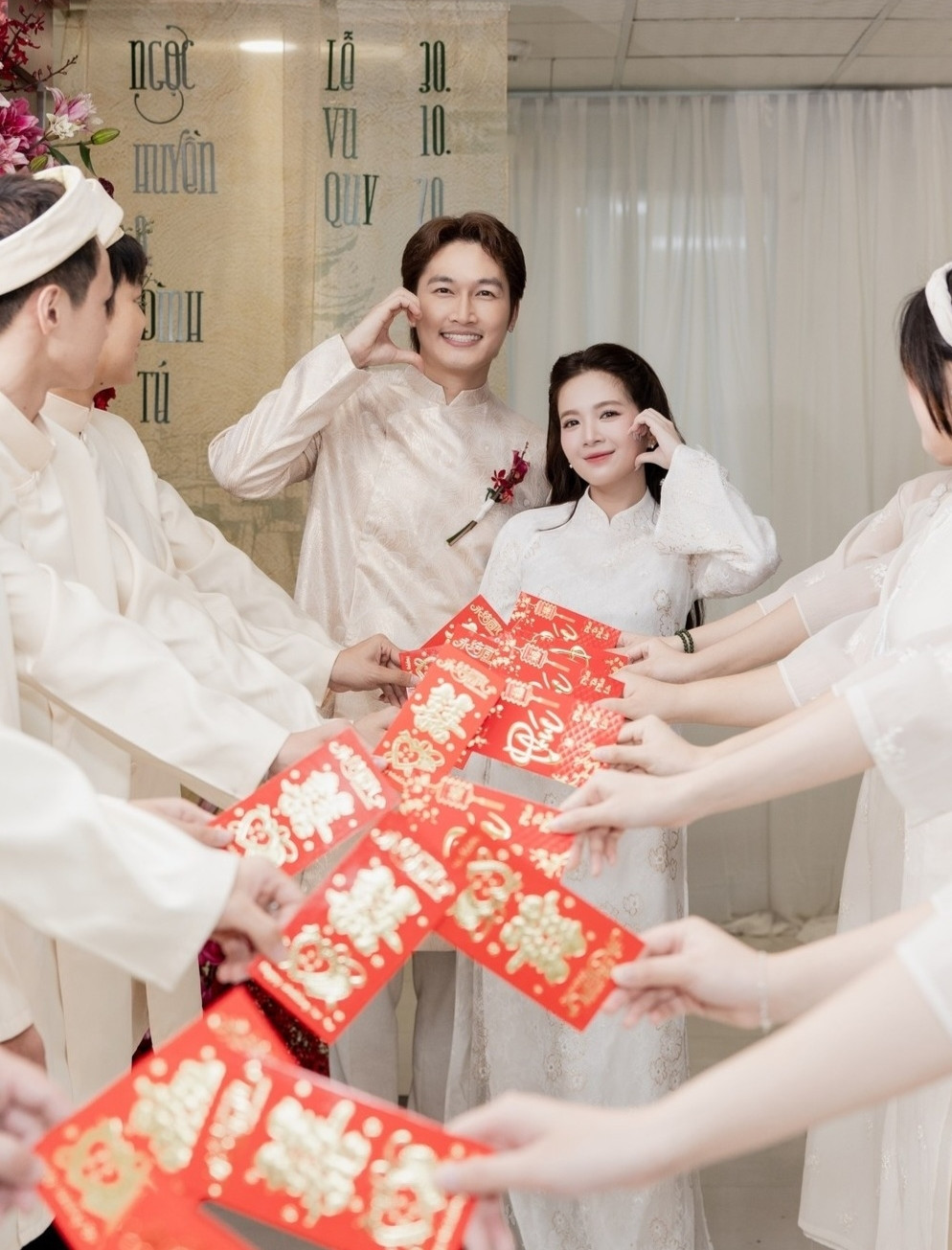 Cặp đôi chỉ mời gia đình và bạn bè thân thiết tham gia lễ ăn hỏi và tổ chức theo nghi lễ truyền thống. Ngọc Huyền trang điểm đơn giản với phong cách make-up trong trẻo. Cô chọn áo dài trắng và váy cưới trong ngày trọng đại. Đình Tú cũng chọn áo dài truyền thống và vest tuxedo lịch lãm.