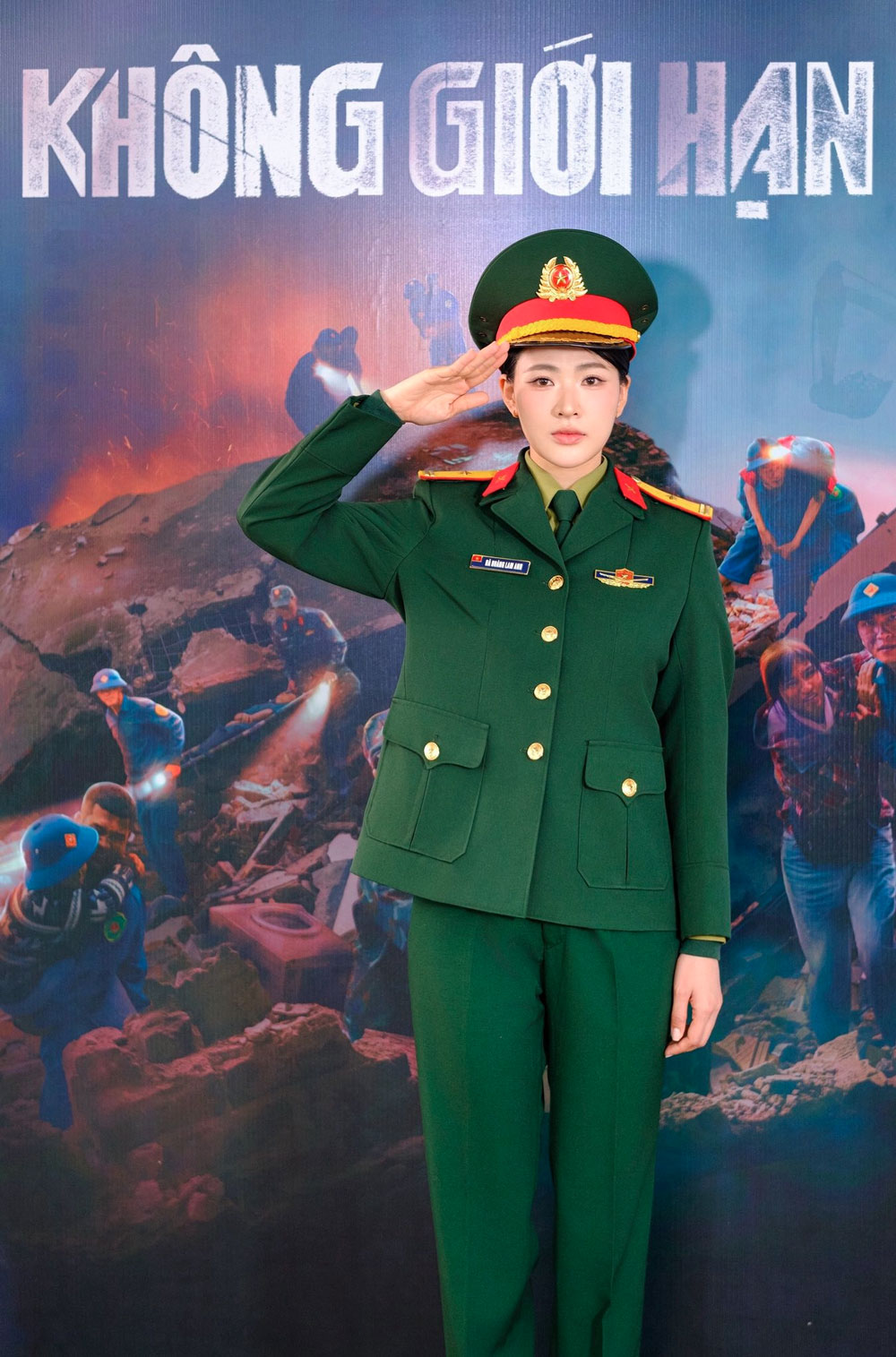 Minh Trang trong bộ quân phục ngày ra mắt phim. Cô nói, đây là bộ trang phục đẹp nhất mình từng mặc. Lam Anh cũng là vai nữ chính của Minh Trang trên phim giờ vàng VTV.