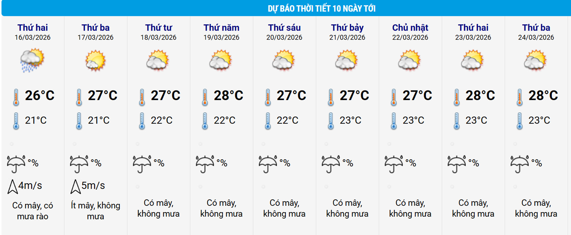 Có mây, ngày nắng, chiều tối và đêm có mưa rào và giông vài nơi. Gió đông đến đông nam cấp 2-3. Trong mưa giông có khả năng xảy ra lốc, sét, mưa đá và gió giật mạnh.