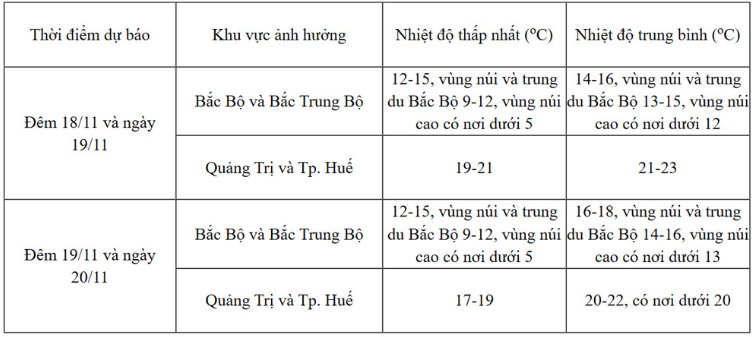 Do ảnh hưởng của không khí lạnh, ở khu vực Bắc Bộ và Bắc Trung Bộ trời rét; vùng núi và trung du Bắc Bộ trời rét đậm, vùng núi cao có nơi rét hại, vùng đồng bằng Bắc Bộ có nơi rét đậm. Từ hôm nay, ở Quảng Trị và Huế đêm và sáng trời rét.