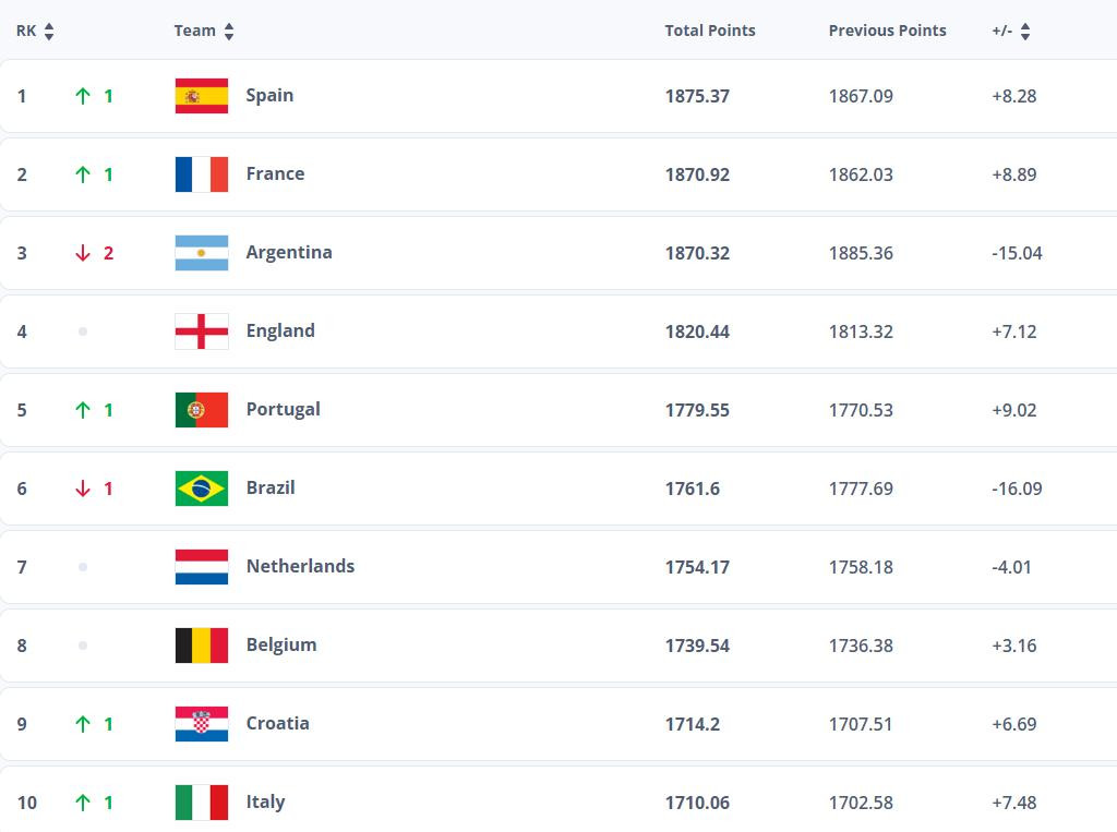 Ở nhóm đầu thế giới, Tây Ban Nha gây tiếng vang lớn khi vượt qua Argentina và Pháp để chiếm ngôi số vị số 1, lần đầu tiên kể từ năm 2014. Nhờ thắng Bulgaria và Thổ Nhĩ Kỳ ở vòng loại World Cup 2026, họ đạt 1.875,37 điểm, vượt Pháp (1.870,92) và Argentina (1.870,32).