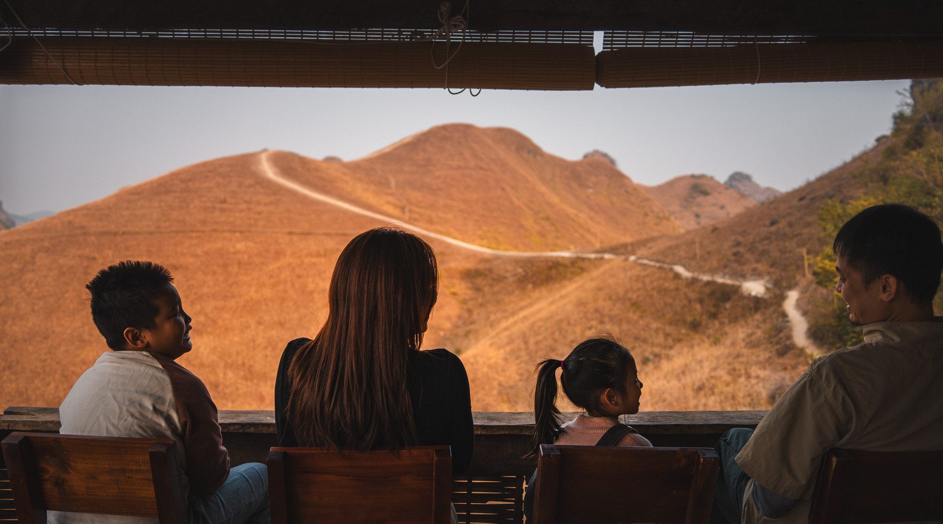 Nắng lên, núi non trùng điệp, những cánh đồng, con suối, đồi cỏ cháy trải dài bất tận… dần hiện ra, khiến gia đình nhỏ mê mẩn.